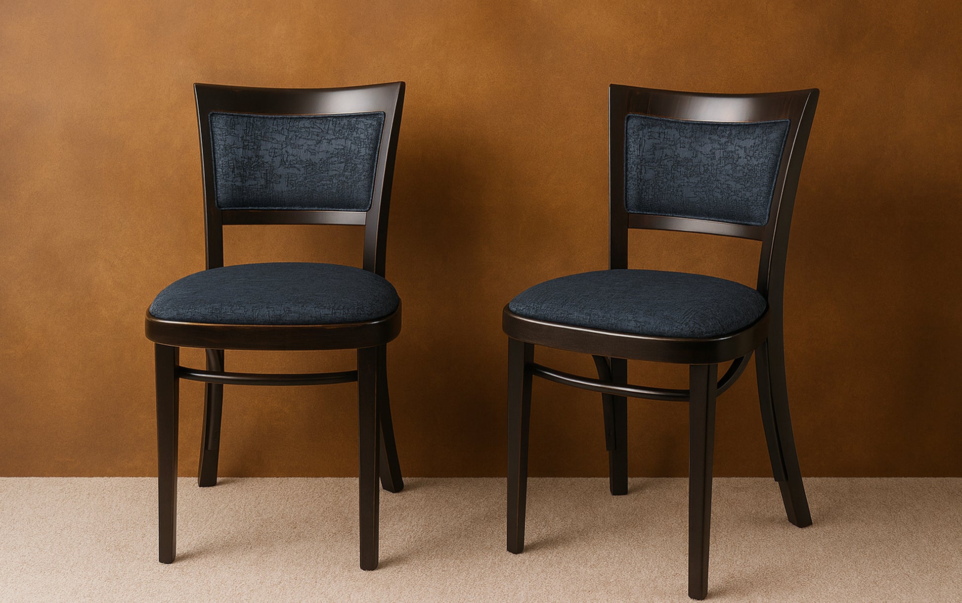 Stilvolle Bistrostühle aus Holz mit luxuriöser Optik. Die dunkel gebeizten Holzgestelle harmonieren perfekt mit der komfortablen Polsterung von Sitz und Rückenlehne in einem eleganten, blaugrauen Stoff mit dezentem Muster.