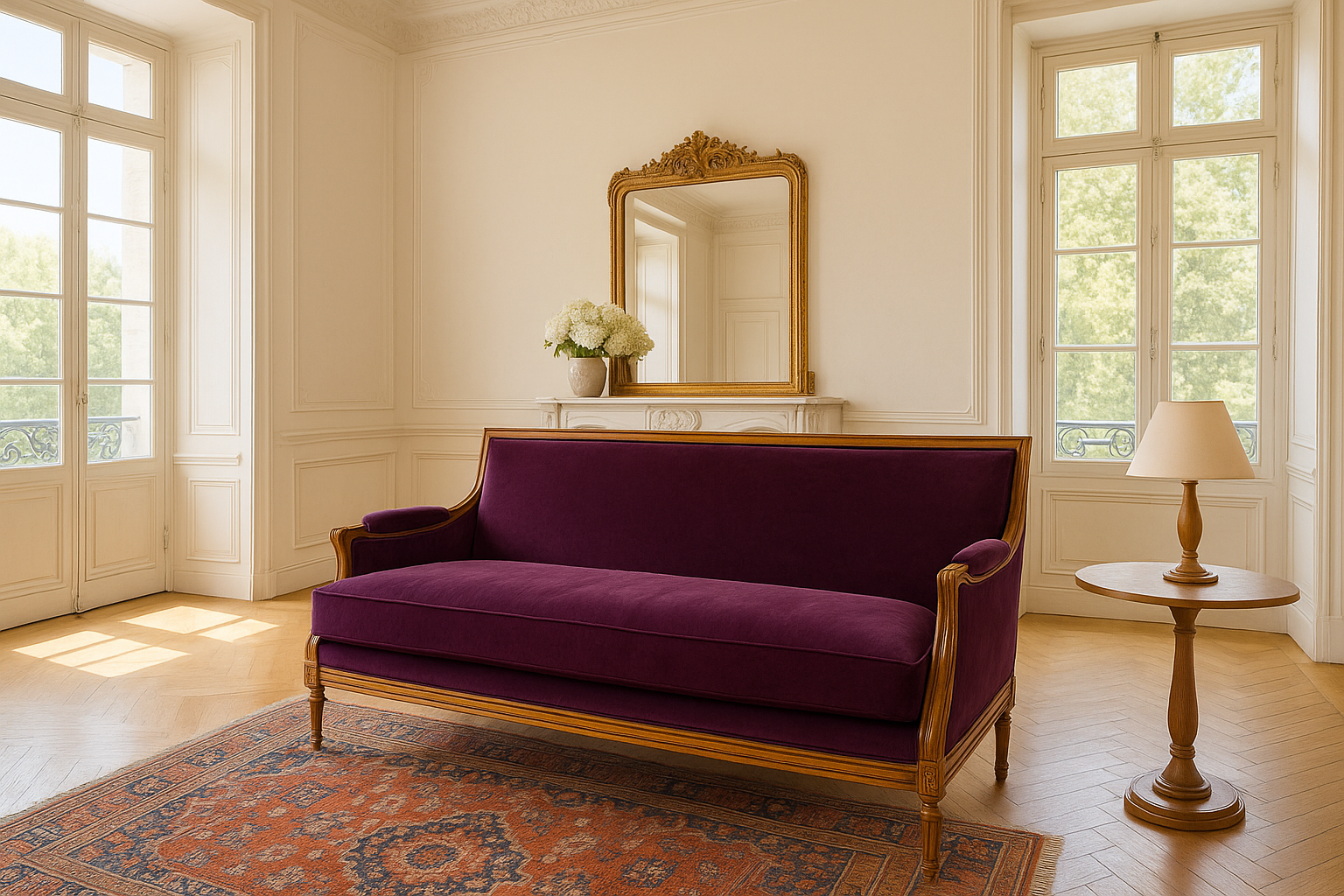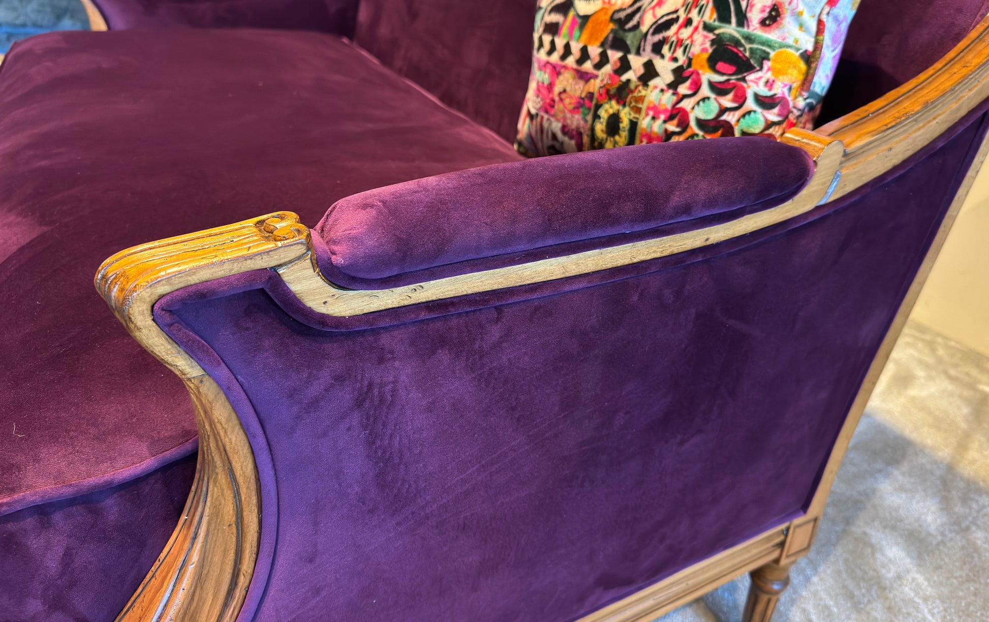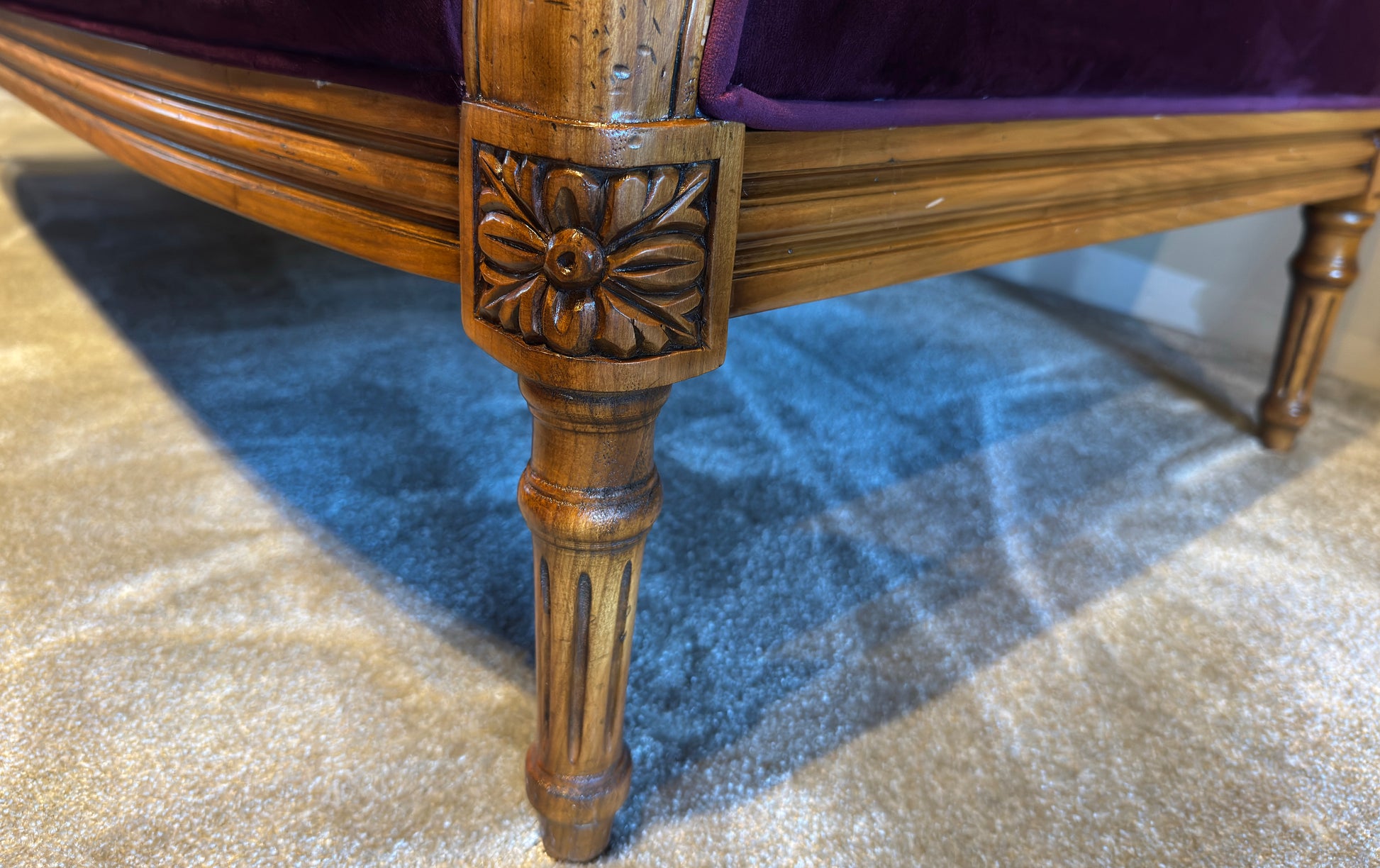 Das Sofa Mazarin ist eine raffinierte Hommage an die französische Eleganz des 18. Jahrhunderts, in der klassische Linien und zeitloser Charme aufeinandertreffen. Der tiefviolette Samtbezug strahlt Luxus und Behaglichkeit aus, während das elegant gebeizte Holzgestell mit seinen sanften Kurven und feinen Schnitzereien handwerkliche Perfektion vermittelt. Die raffinierten Details, von den elegant geformten Armlehnen bis zu den dezent zulaufenden Beinen, machen dieses Sofa zu einem Blickfang in jedem Interieur.