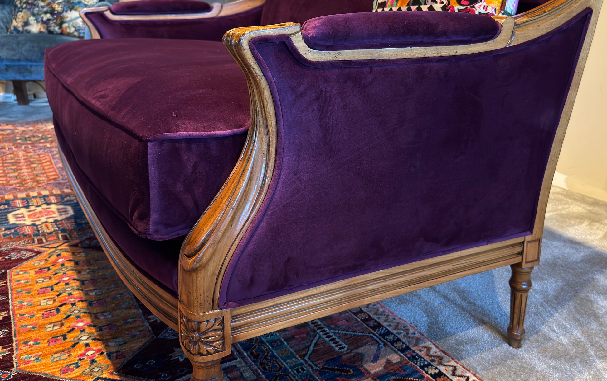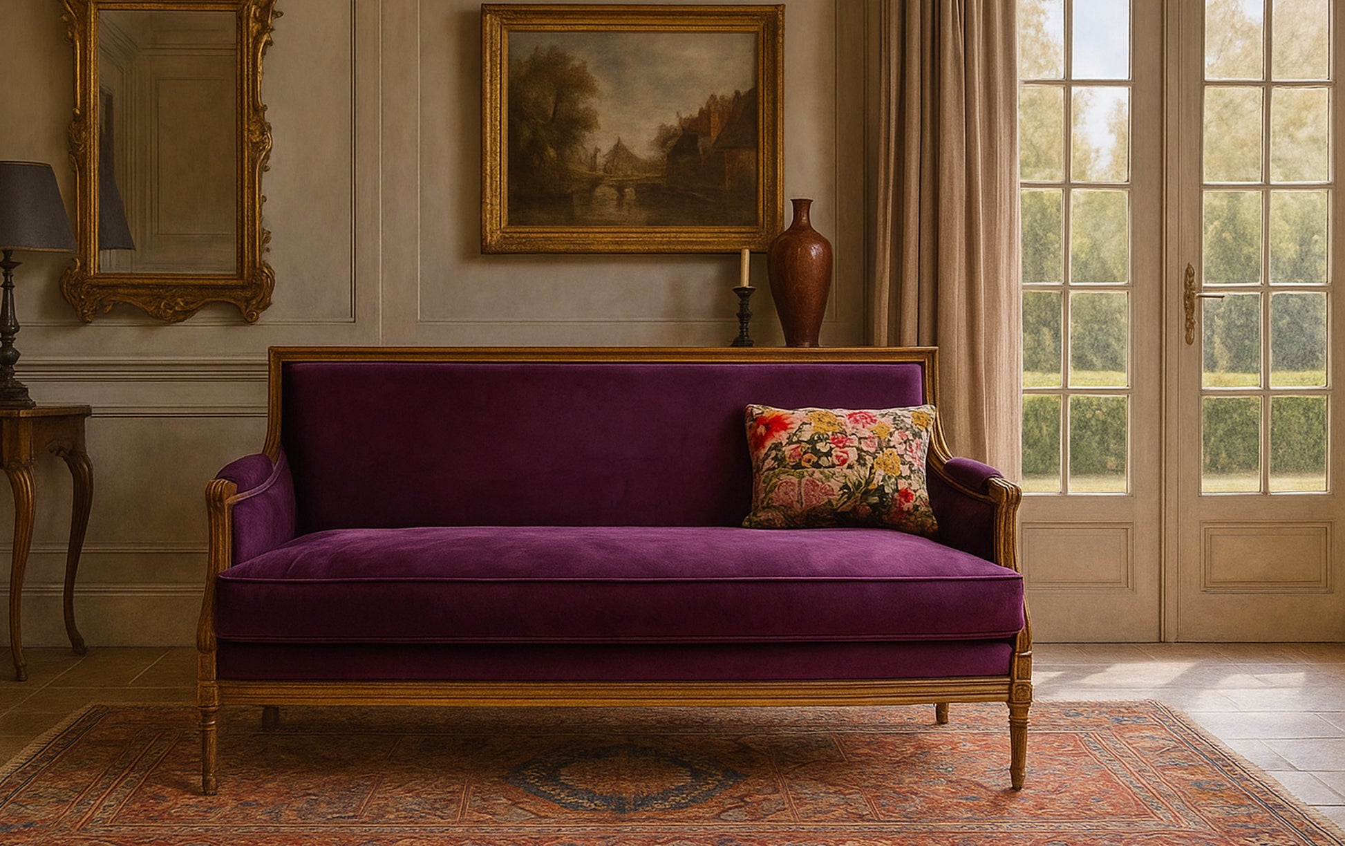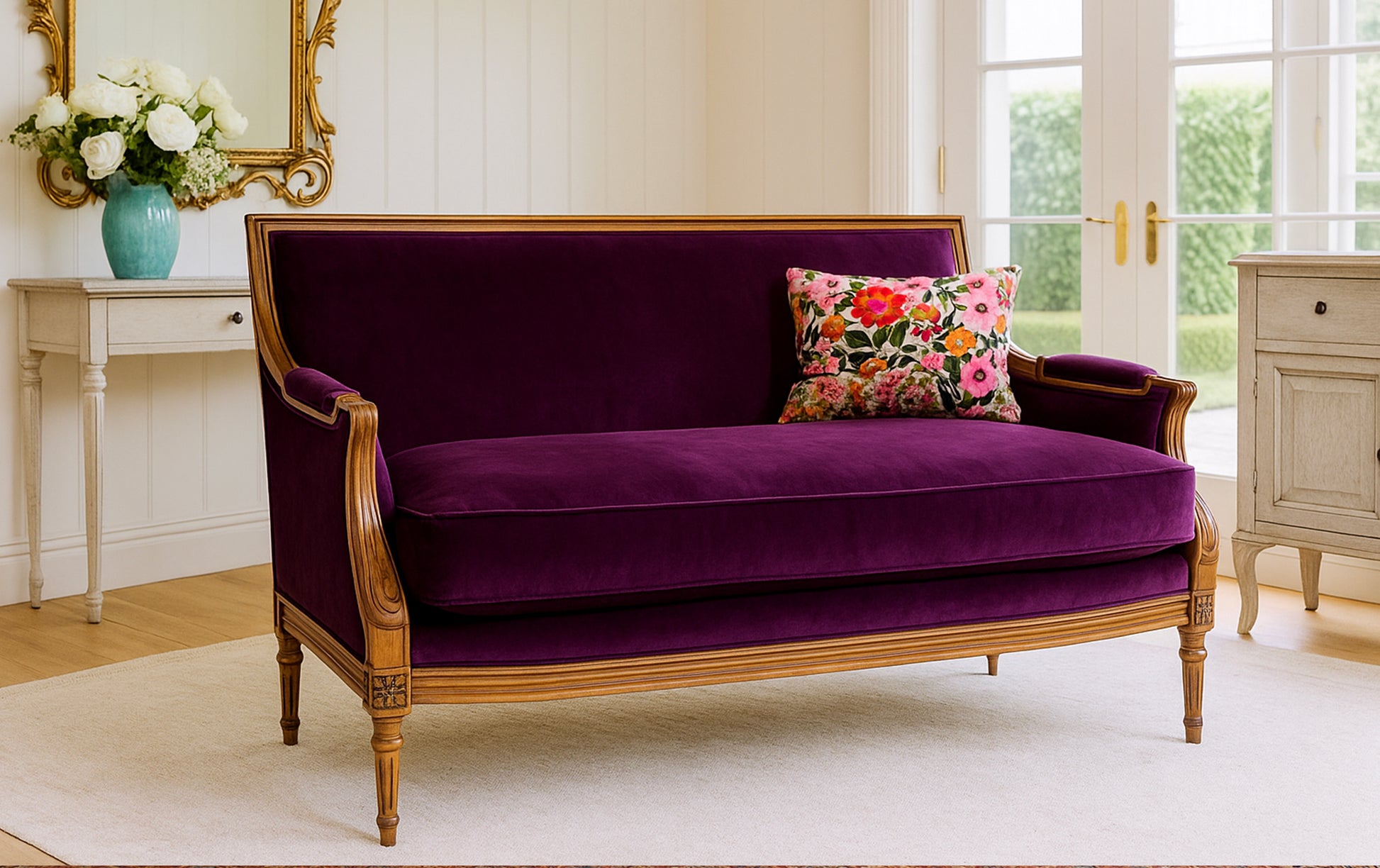 Das Sofa Mazarin ist eine raffinierte Hommage an die französische Eleganz des 18. Jahrhunderts, in der klassische Linien und zeitloser Charme aufeinandertreffen. Der tiefviolette Samtbezug strahlt Luxus und Behaglichkeit aus, während das elegant gebeizte Holzgestell mit seinen sanften Kurven und feinen Schnitzereien handwerkliche Perfektion vermittelt. Die raffinierten Details, von den elegant geformten Armlehnen bis zu den dezent zulaufenden Beinen, machen dieses Sofa zu einem Blickfang in jedem Interieur.