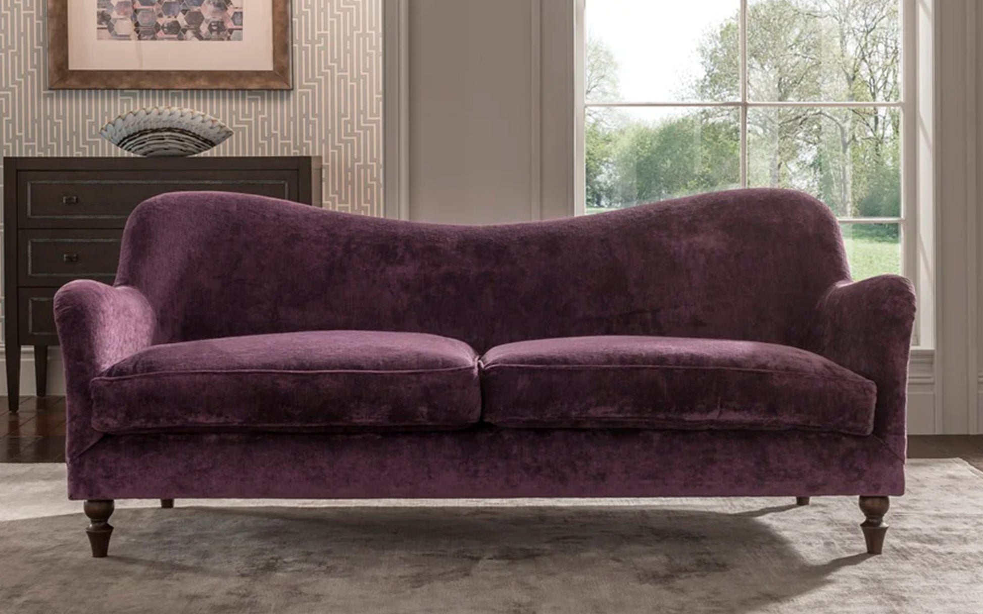 Een elegante Engelse bank Tiffany met een klassieke uitstraling, uitgevoerd in warme paars kleurige stof. De bank heeft zachte, ronde vormen, losse zit- en rugkussens en decoratieve sierkussens die zorgen voor een luxe en comfortabele uitstraling. Perfect voor een stijlvol en tijdloos interieur.