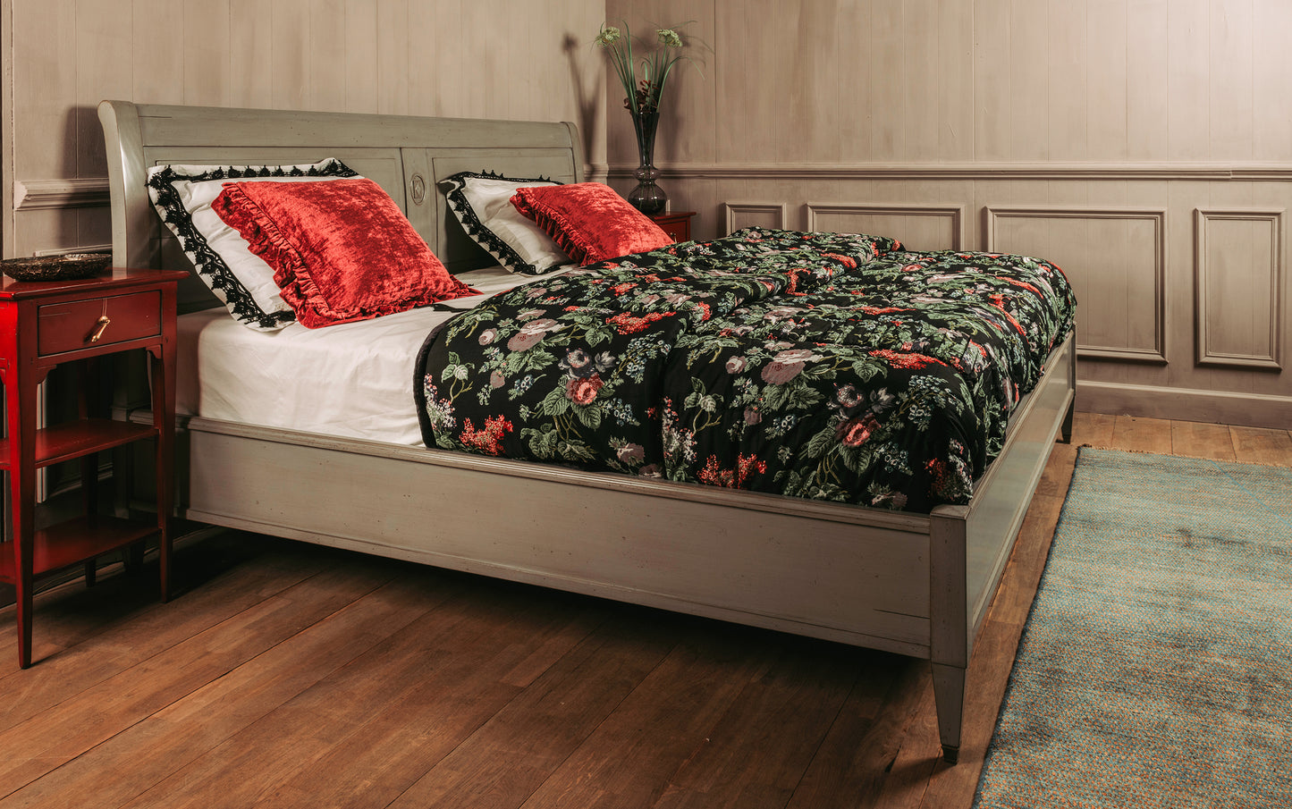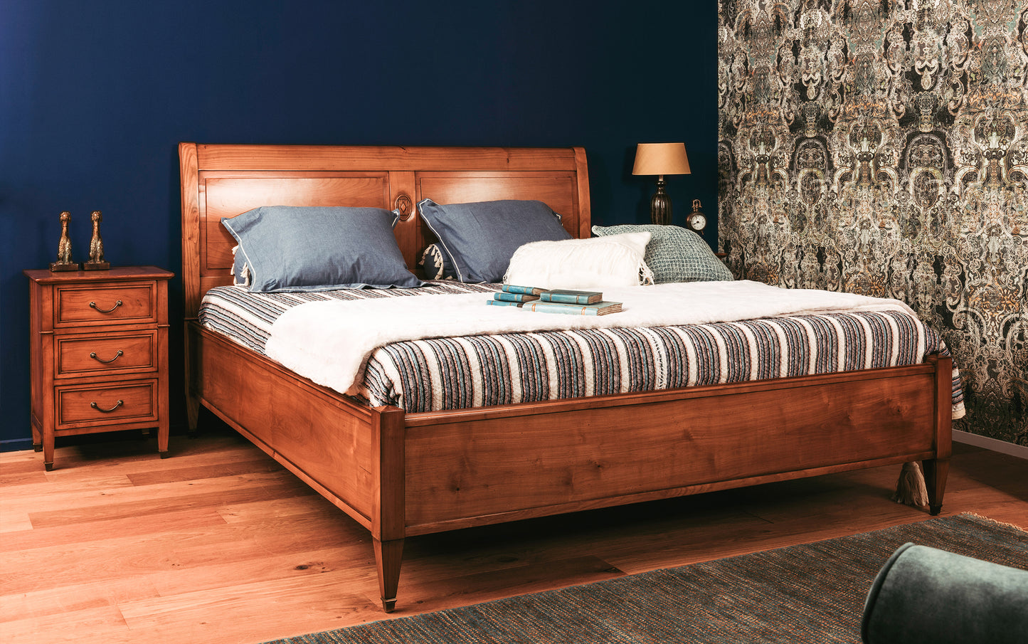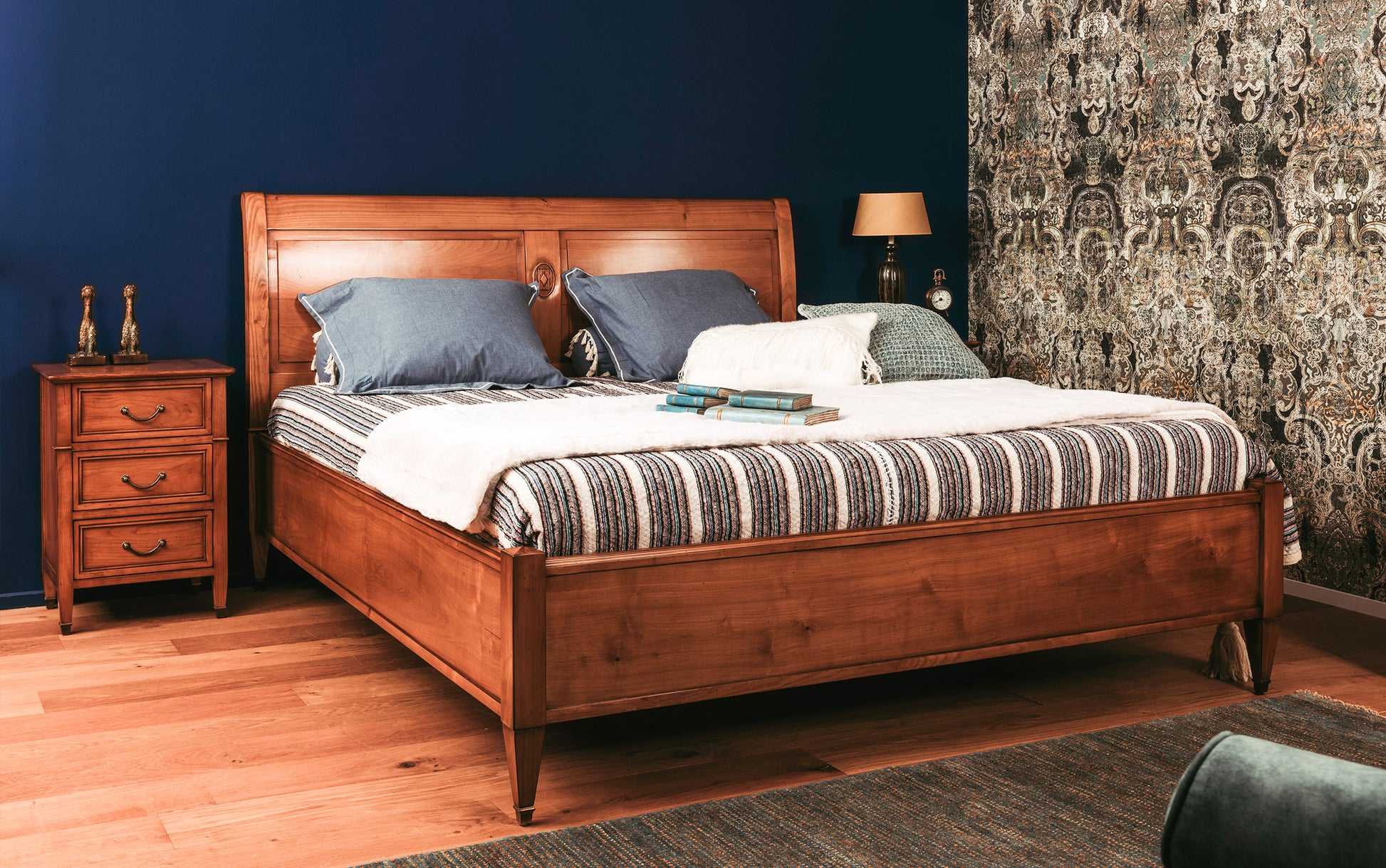 Französisches Holzschlafzimmer Directoire aus der Livingstone-Kollektion. Erhältlich mit hohem (121 cm) oder niedrigem Kopfteil (95 cm).
