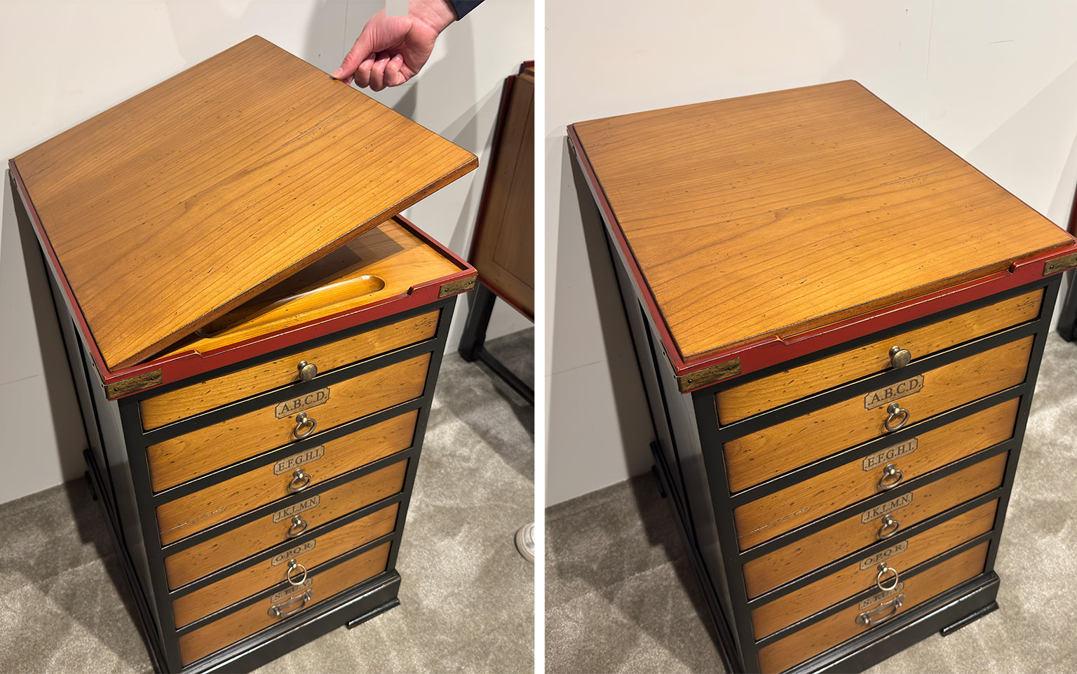 Dieses Möbelstück wurde von einem antiken Möbelstück inspiriert, das als Werkbank eines Uhrmachers zum Zerlegen von Zeitmessern diente. Auf der Arbeitsplatte befindet sich eine Nut, die dazu dient, Teile an Ort und Stelle zu halten und ein Herunterfallen zu verhindern. Die vielen Schubladen machen es zu einem sehr nützlichen modernen Möbelstück.