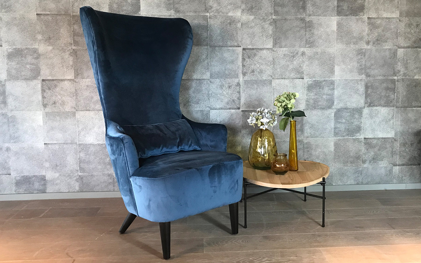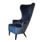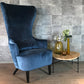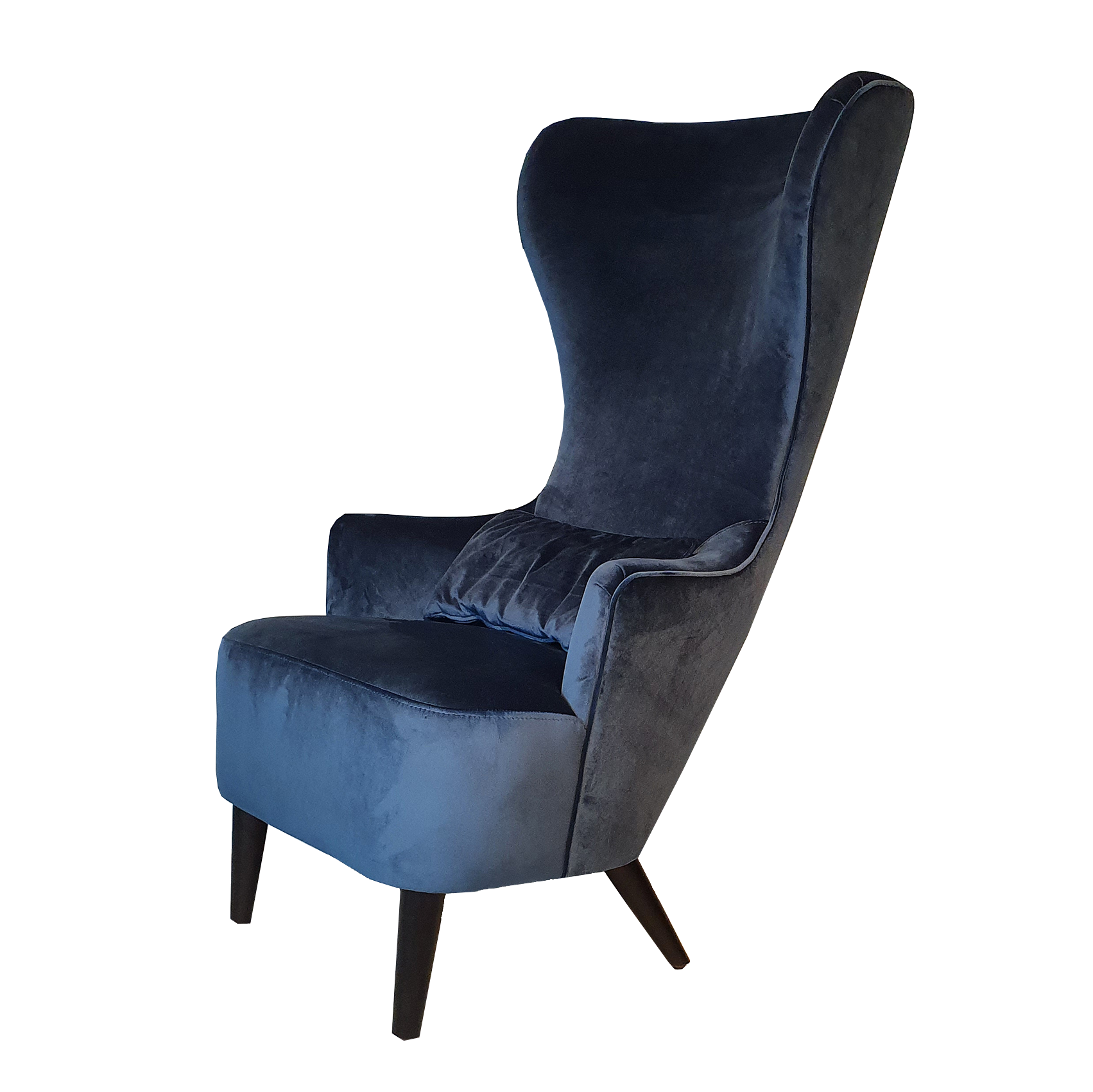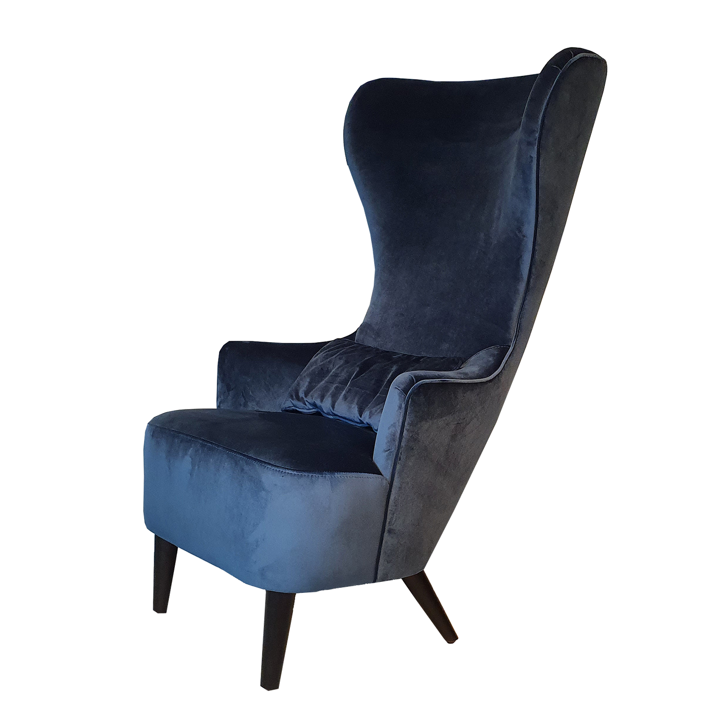 Sessel mit runden Formen und hoher Rückenlehne aus wunderschönem blauem Samt.