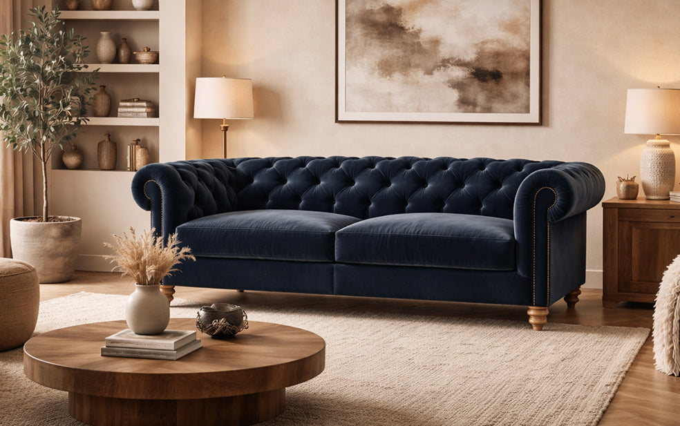Das englische Sofa Coniston kommt in einem warmen, modernen Ambiente besonders gut zur Geltung. Sein tiefes, sattes Blau bildet einen eleganten Kontrast zu sanften Erdtönen, Naturholz und warmem Licht. Die klassische Knopfheftung bleibt erhalten, doch die dezenten Materialien und das großzügige Design verleihen ihm eine zeitgemäße und einladende Ausstrahlung.