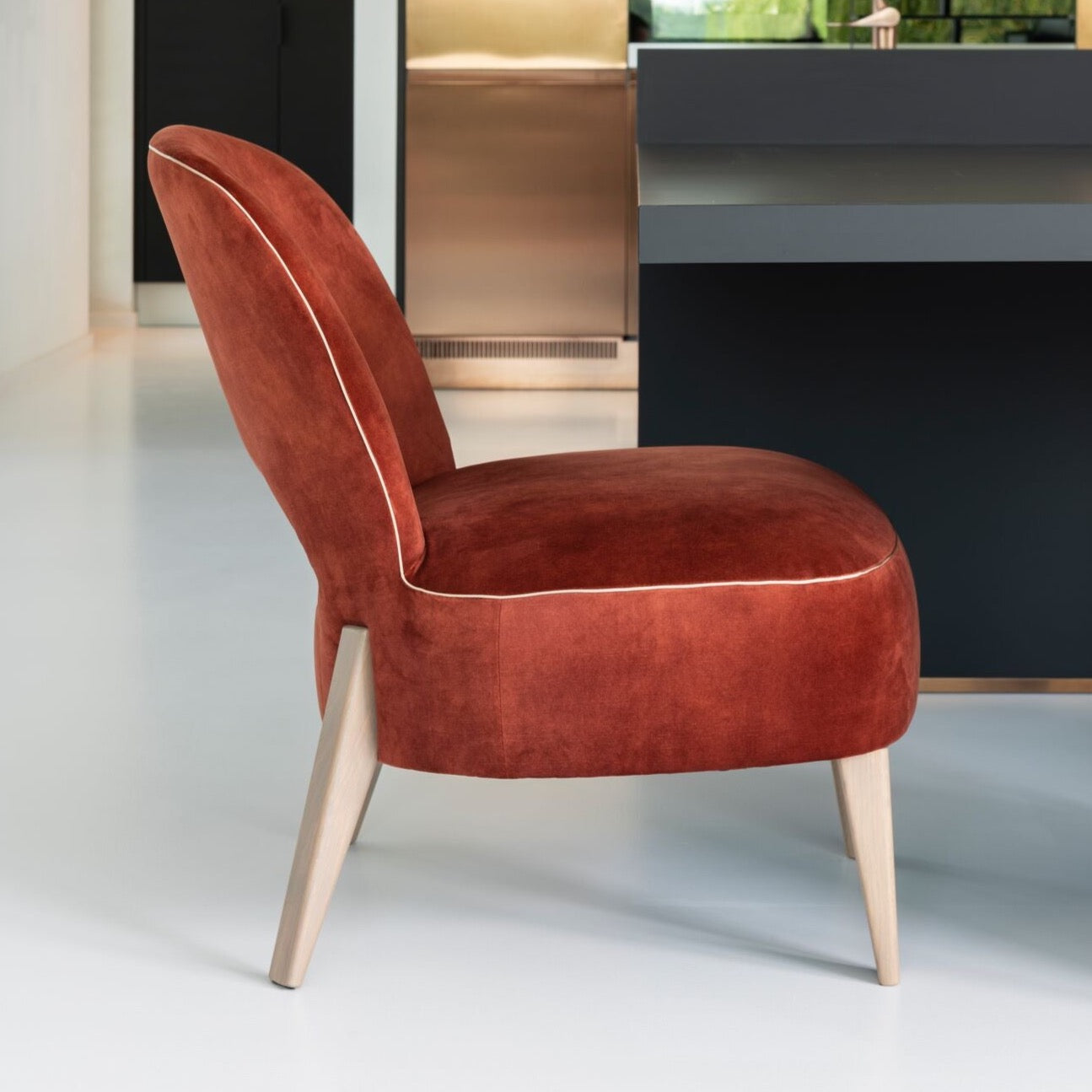 Bei näherer Betrachtung des Moon-Sessels fallen überraschende Details auf, wie der nahtlose Übergang des optionalen Kontrastkeders zwischen Sitzfläche und Rückenlehne sowie die schöne Integration des Untergestells in die Polsterung der Sitzfläche.