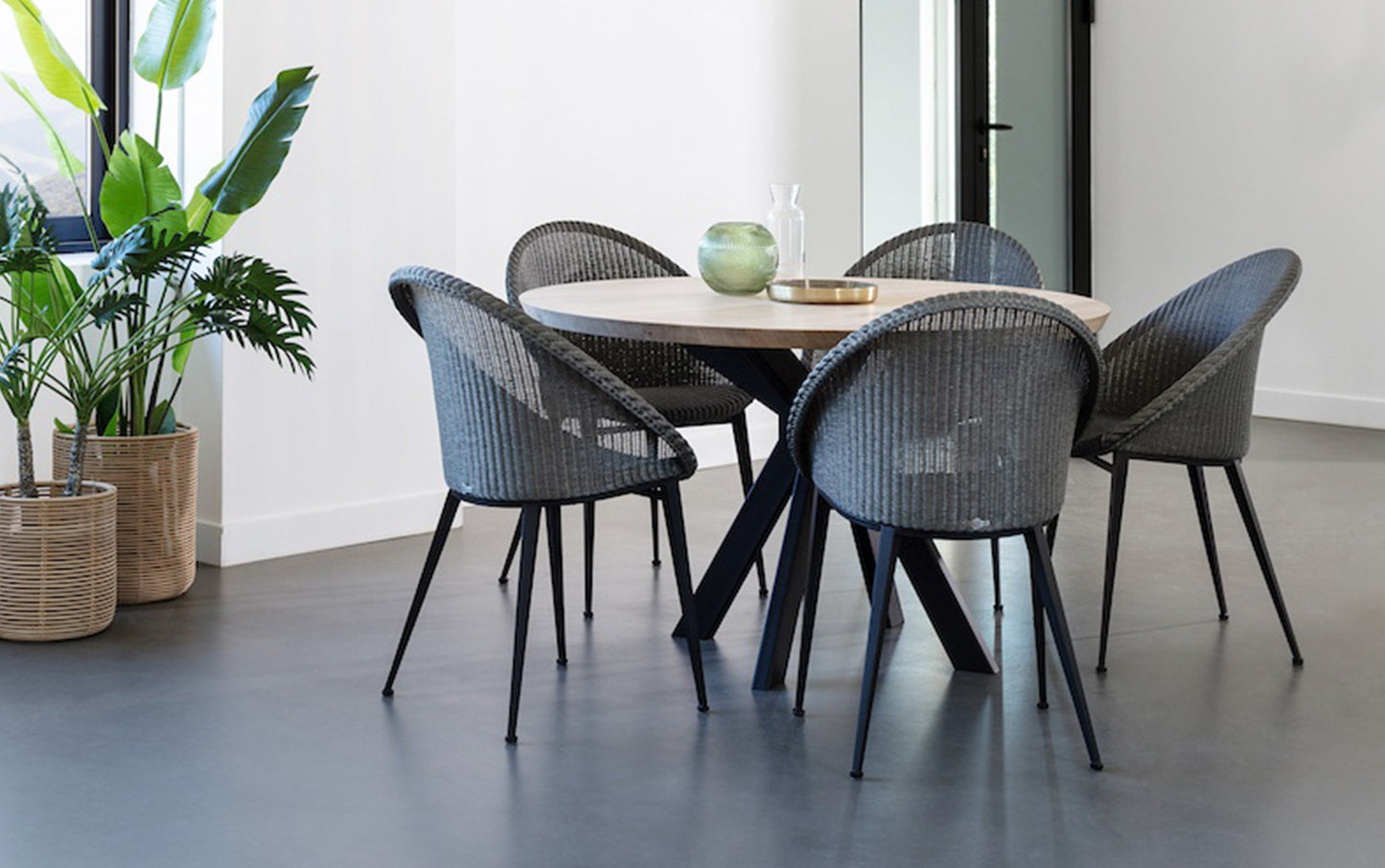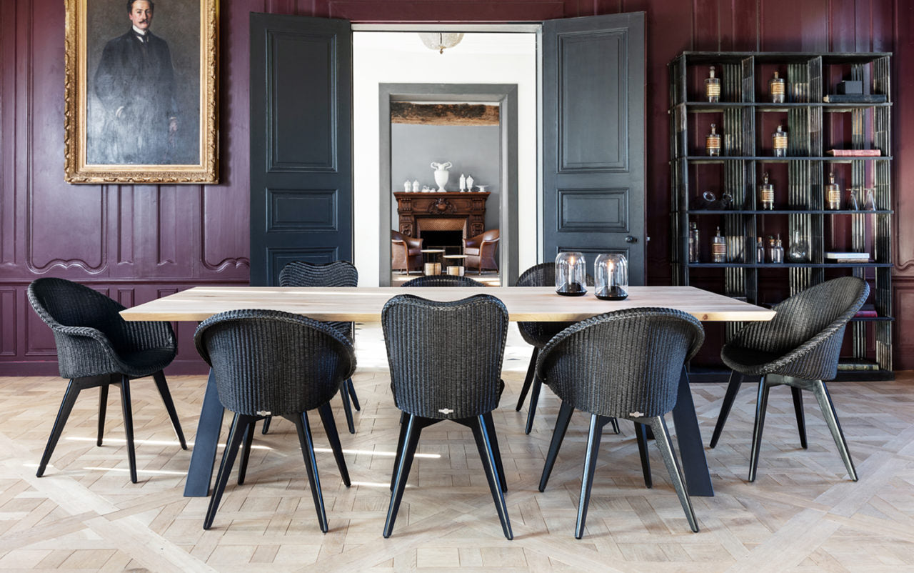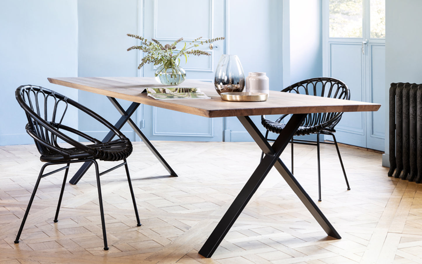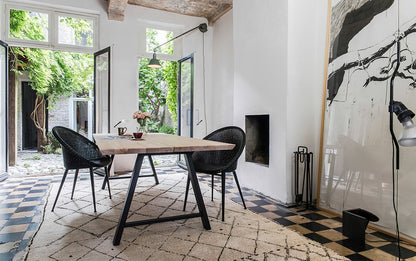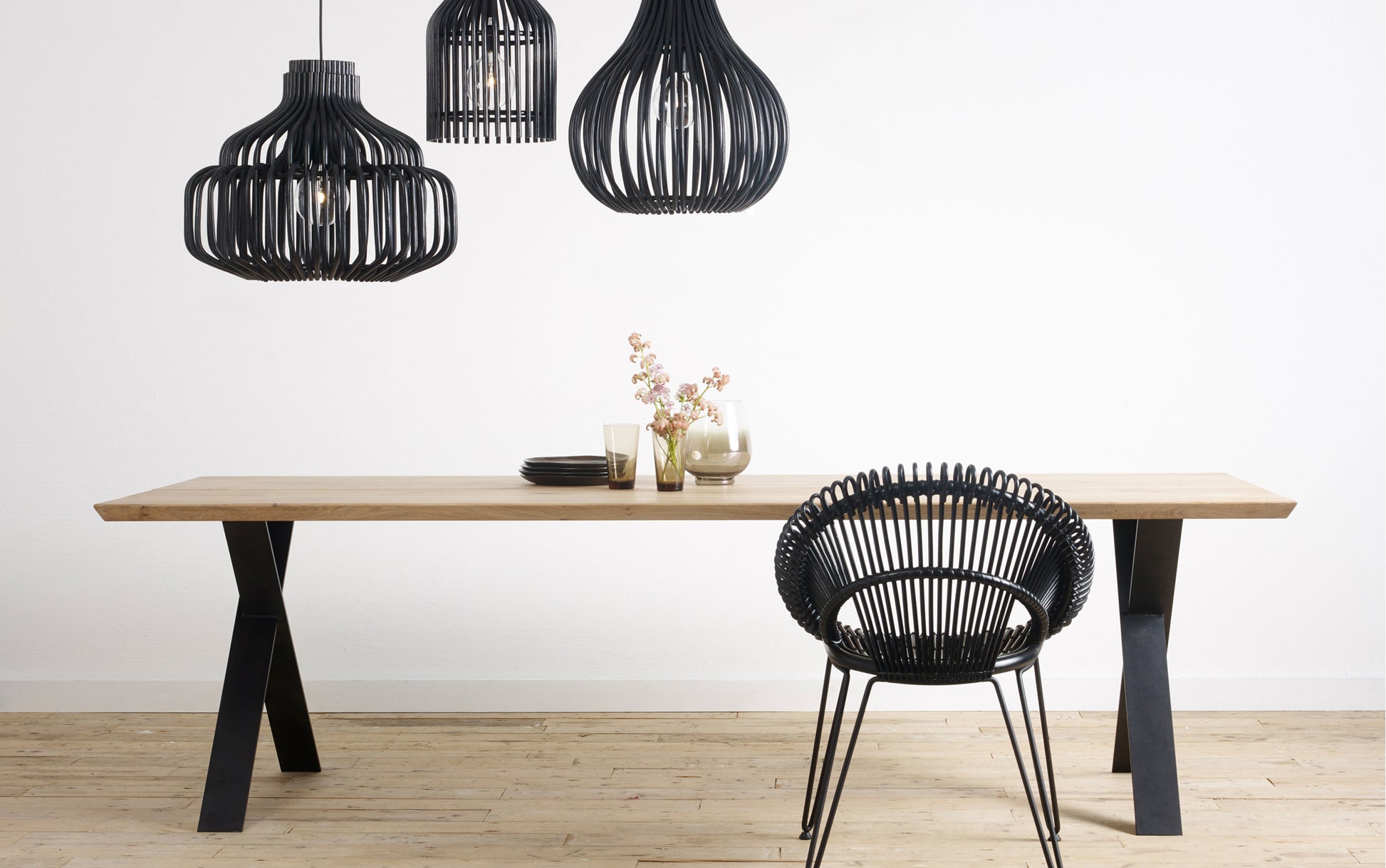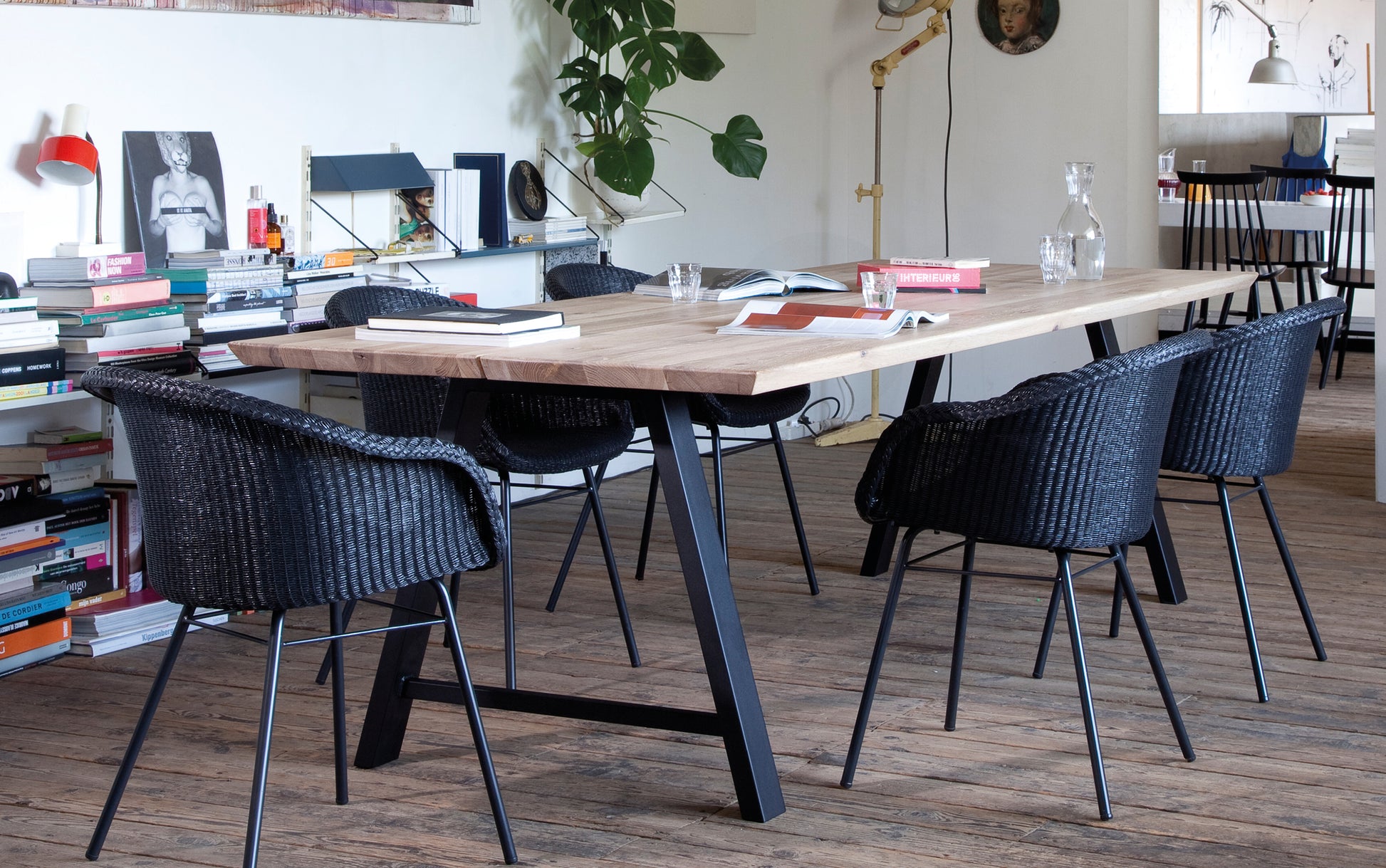 Esszimmertisch Vincent Sheppard mit Eichenplatte und Stahlgestell. Hat einen industriellen Look und passt in ein modernes und zeitloses Interieur. Die Klinge kann ein- oder zweiteilig sein. Die Stahlbasis kann in A-Form oder X-Form sein.