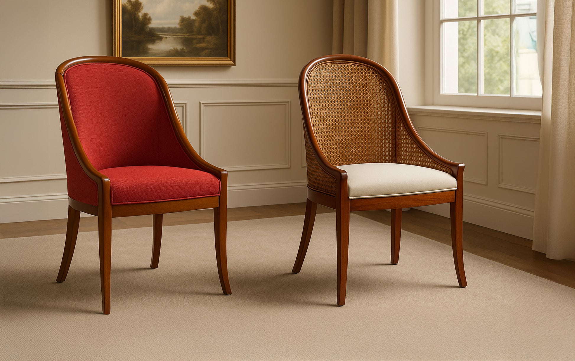 Eleganter Empire-Sessel mit handgeflochtener Rattanlehne und leichtem Stoffbezug. Das warme Holz und das luftige Design vereinen handwerkliches Können und Eleganz. Ideal für stilvolle Ess- oder Wohnräume.
