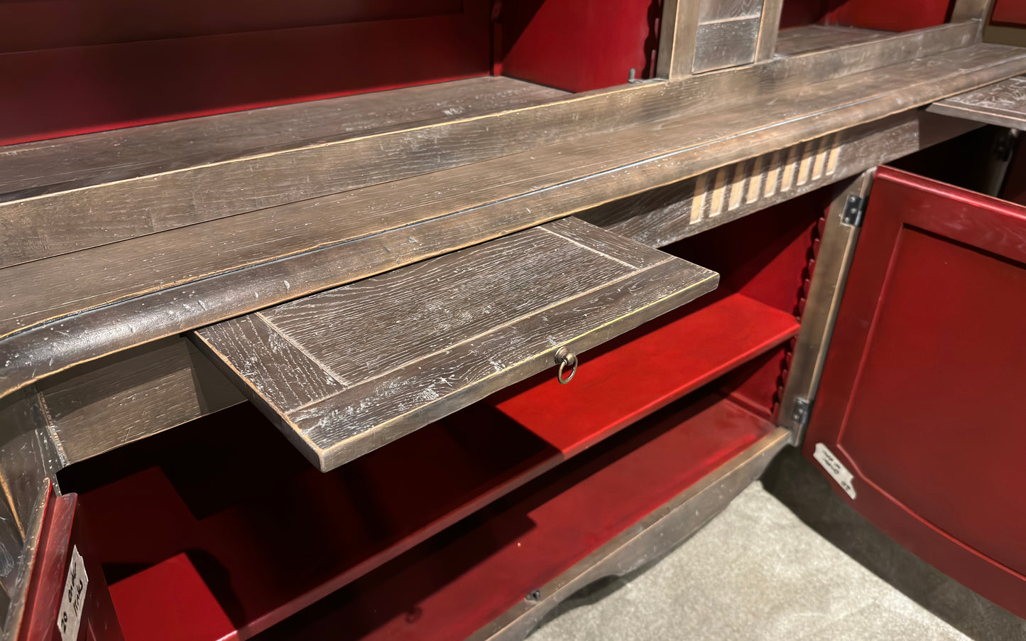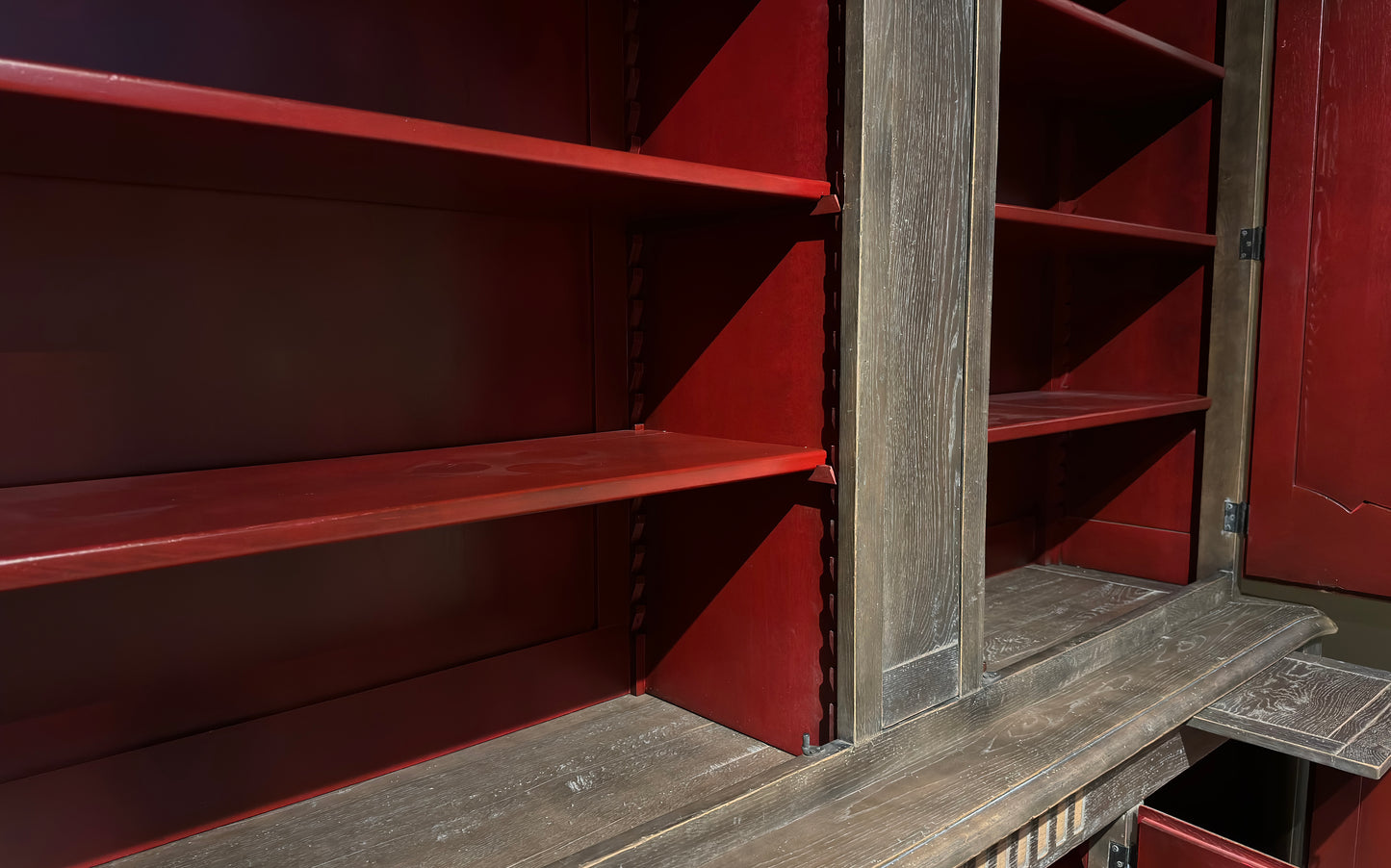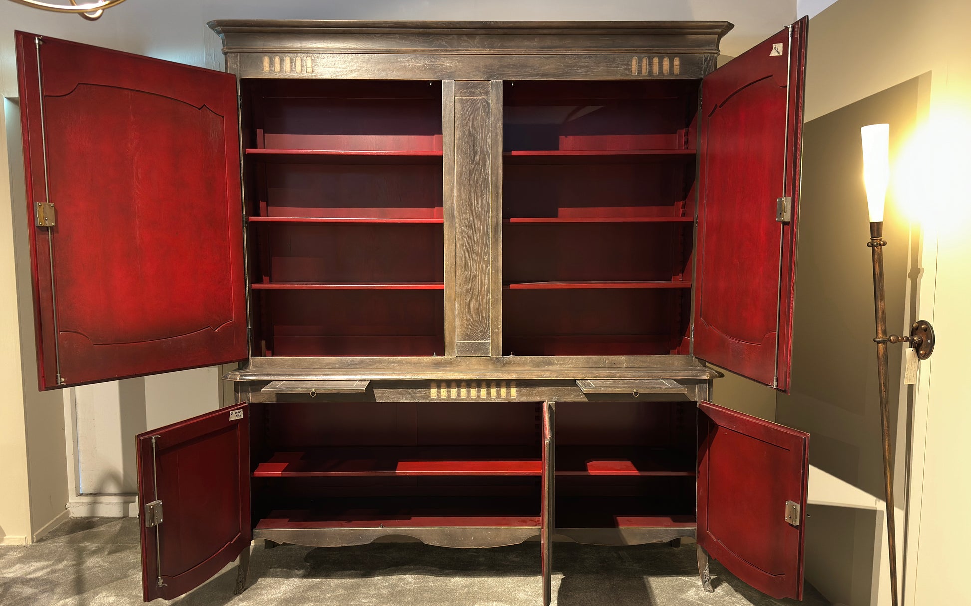 Großes Sideboard Auberge. Aus Eichenholz. Außen ist es grau, innen ist es tiefrot. Kleine Details in Creme. Der Oberschrank hat 2 Türen und der Unterschrank hat 3 Türen. Der Oberschrank fällt leicht nach hinten ab und ist weniger tief als der Unterschrank. Ausgestattet mit 2 Schiebeflügeln.