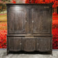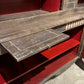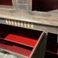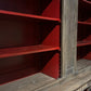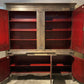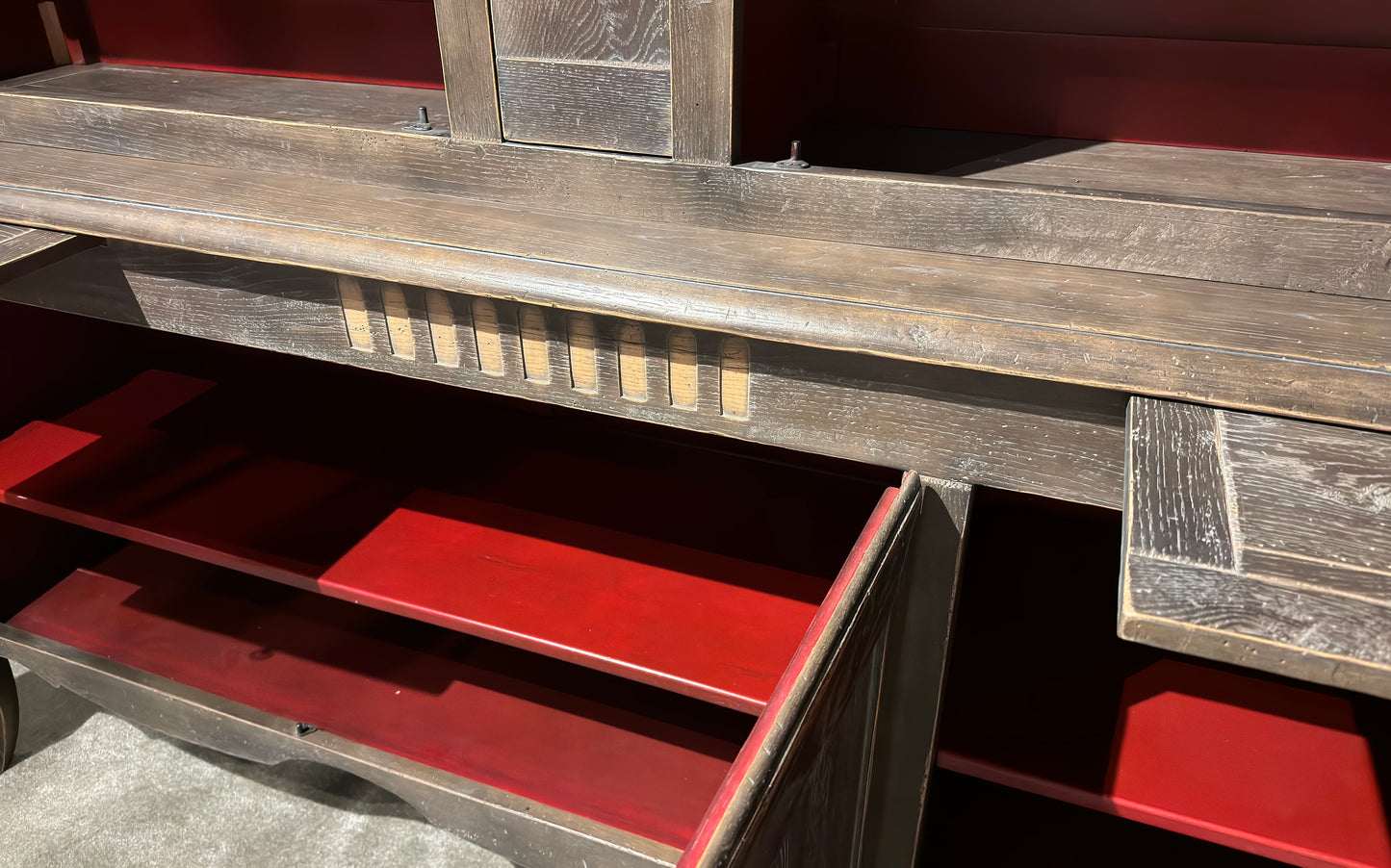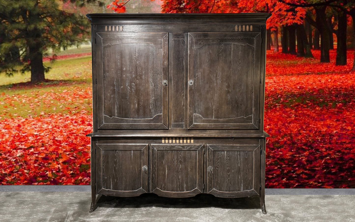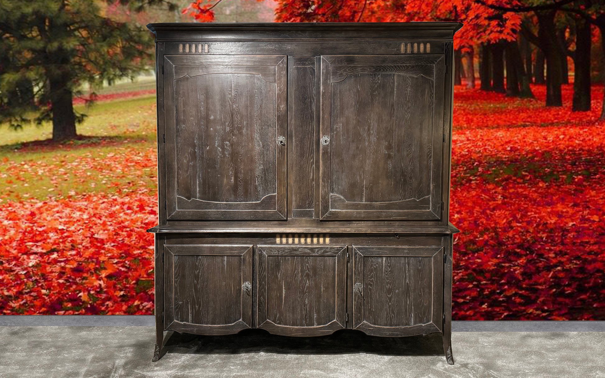 Großes Sideboard Auberge. Aus Eichenholz. Außen ist es grau, innen ist es tiefrot. Kleine Details in Creme. Der Oberschrank hat 2 Türen und der Unterschrank hat 3 Türen. Der Oberschrank fällt leicht nach hinten ab und ist weniger tief als der Unterschrank. Ausgestattet mit 2 Schiebeflügeln.
