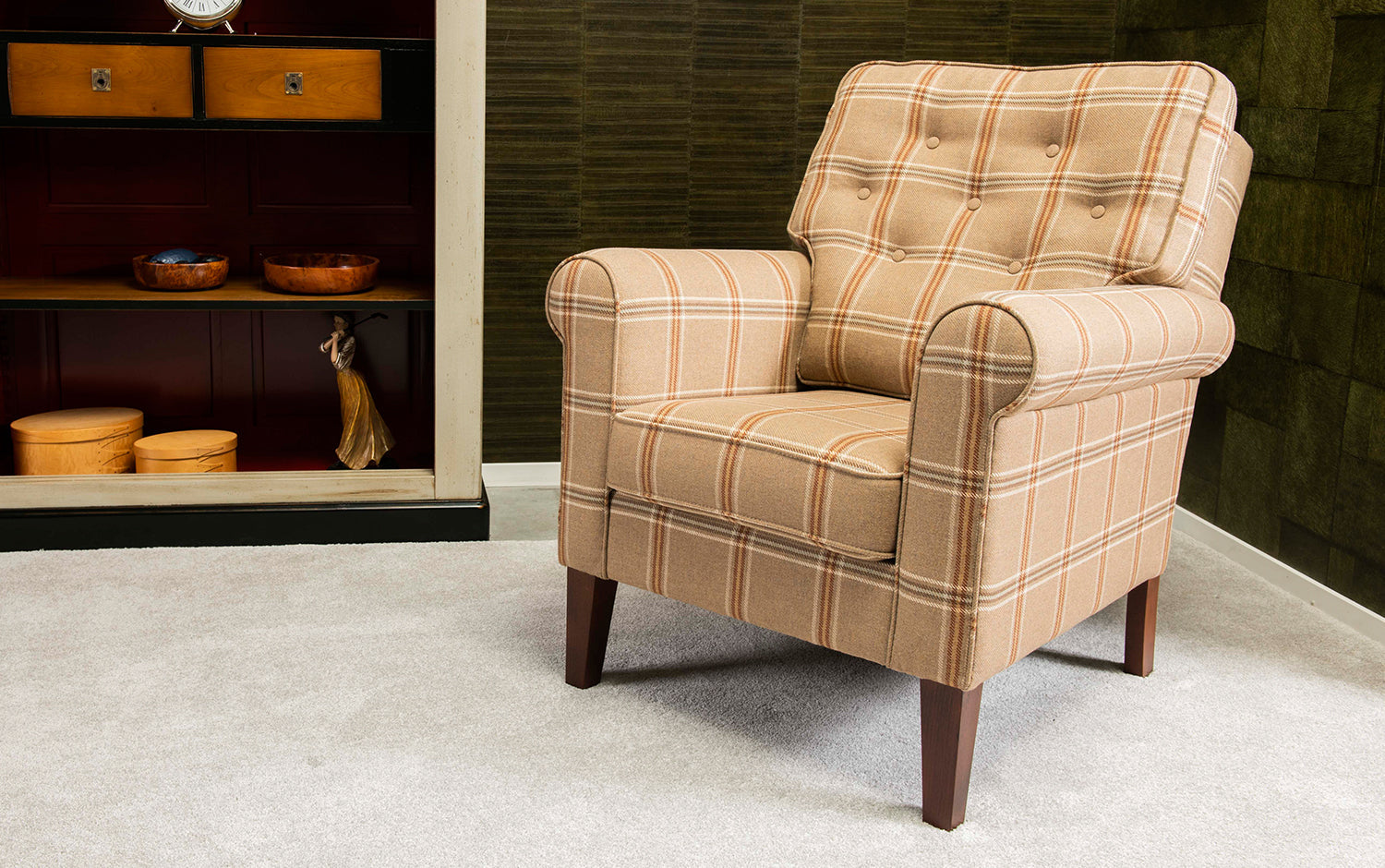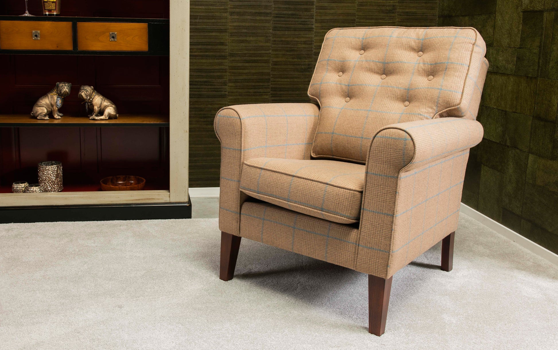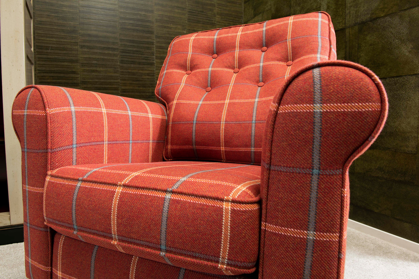Englischer Sessel auf Rädern mit Knöpfen auf der Rückseite. Ein klassischer Stuhl, der sich in jeden Einrichtungsstil einfügt, als Beistellsitz oder Teil des Sofas. Die Sessel sehen sehr schön aus, wenn 2 nebeneinander stehen. Kann in jedem gewünschten Stoff hergestellt werden