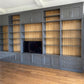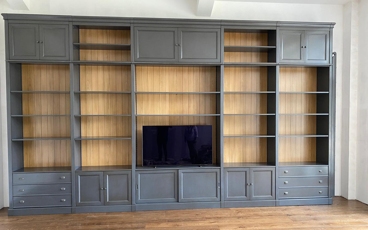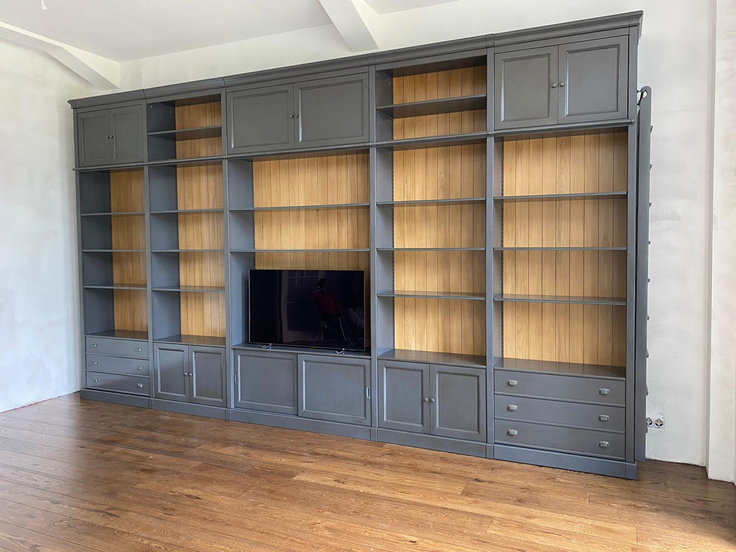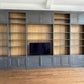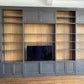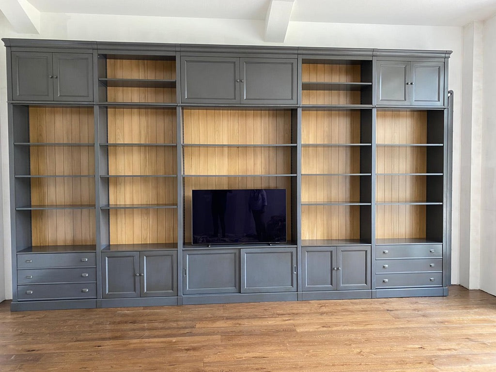 Dieser beeindruckende Schrank mit einer Breite von 547 cm und einer Höhe von 320 cm vereint Funktionalität mit luxuriöser Optik. Der in Anthrazit mit hellem Kirschholz gefertigte Schrank bietet Platz für Bücher, einen Fernseher und zusätzlichen Stauraum. Die Messingstange für die Leiter sowie die praktischen Schubladen und Türen runden das Design ab.