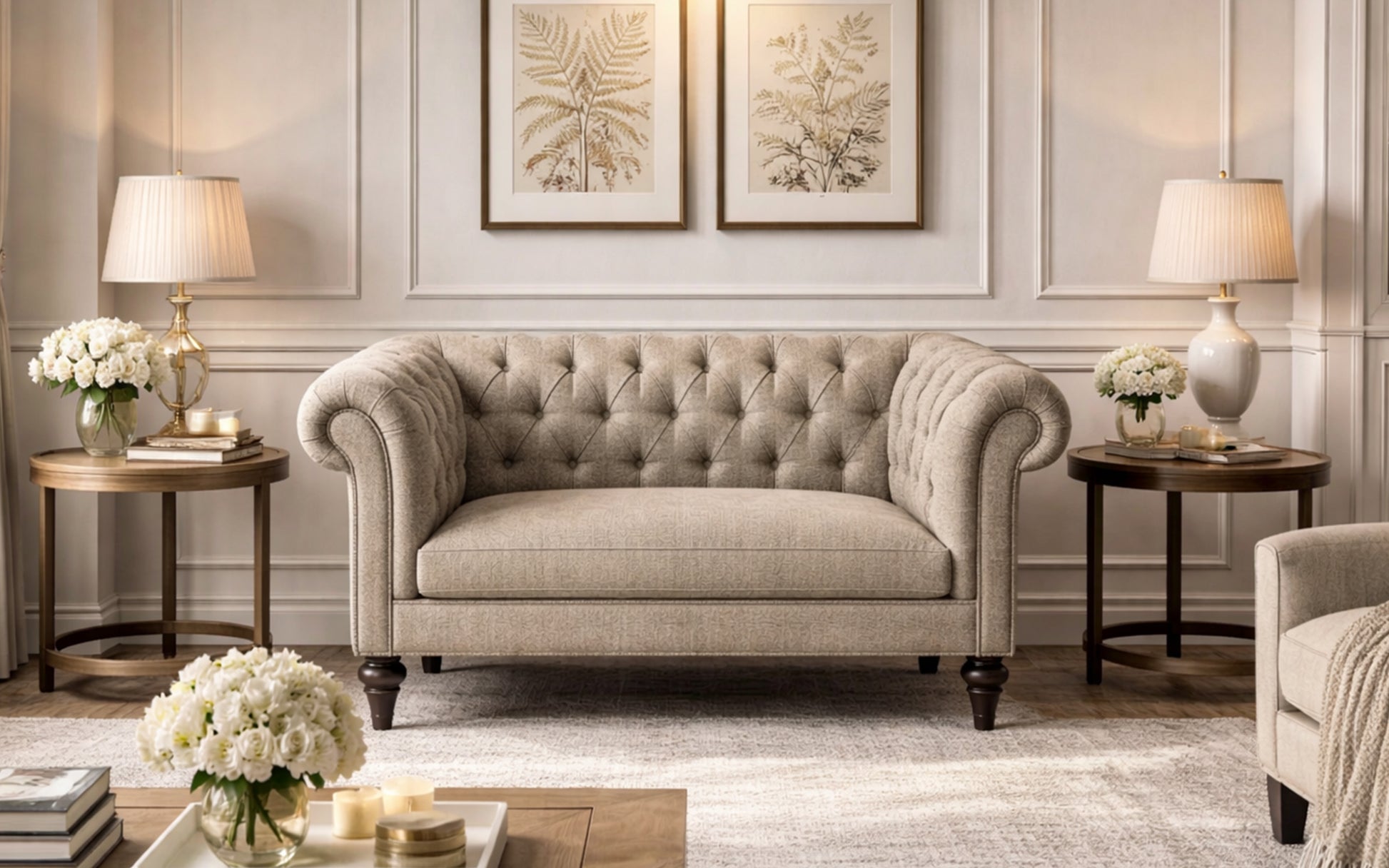 De Regent snuggler straalt tijdloze elegantie en verfijnde luxe uit. Met haar sierlijke, afgeronde armleuningen en diep gecapitonneerde rugleuning is deze snuggler een eerbetoon aan klassiek Brits vakmanschap. De zachte, neutrale bekleding geeft haar een warme en uitnodigende uitstraling, terwijl de rijke textuur subtiel diepte en karakter toevoegt.