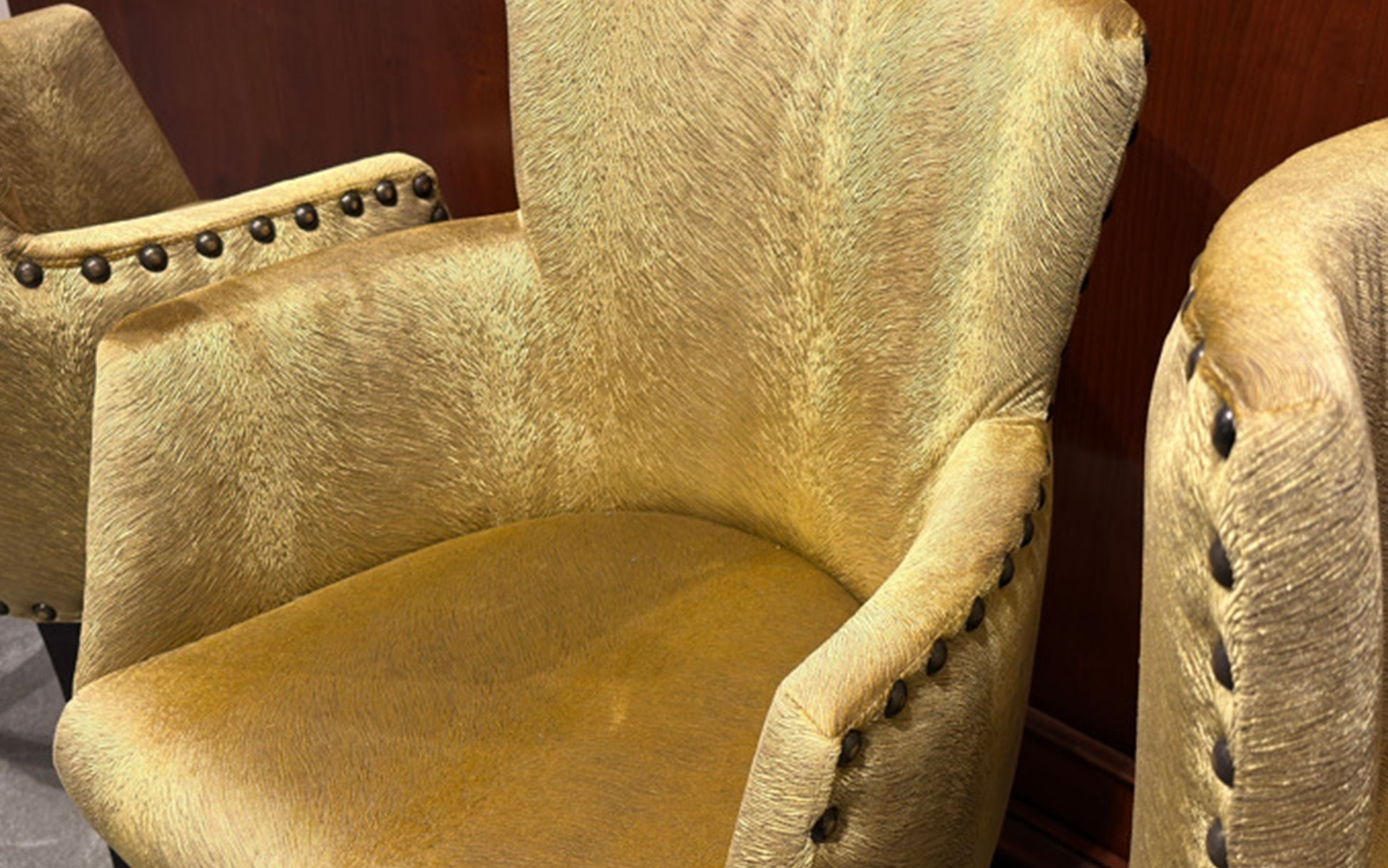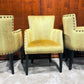 Ein kleiner Sessel oder Stuhl, elegant gepolstert mit gelbem Stoff. Abgerundet mit großen Ziernägeln für einen schicken Look. Dieses vielseitige Möbelstück verleiht jedem Raum einen Hauch von Eleganz. Perfekt als Beistellstuhl im Wohnzimmer oder als charmante Ergänzung für Ihr Schlafzimmer.