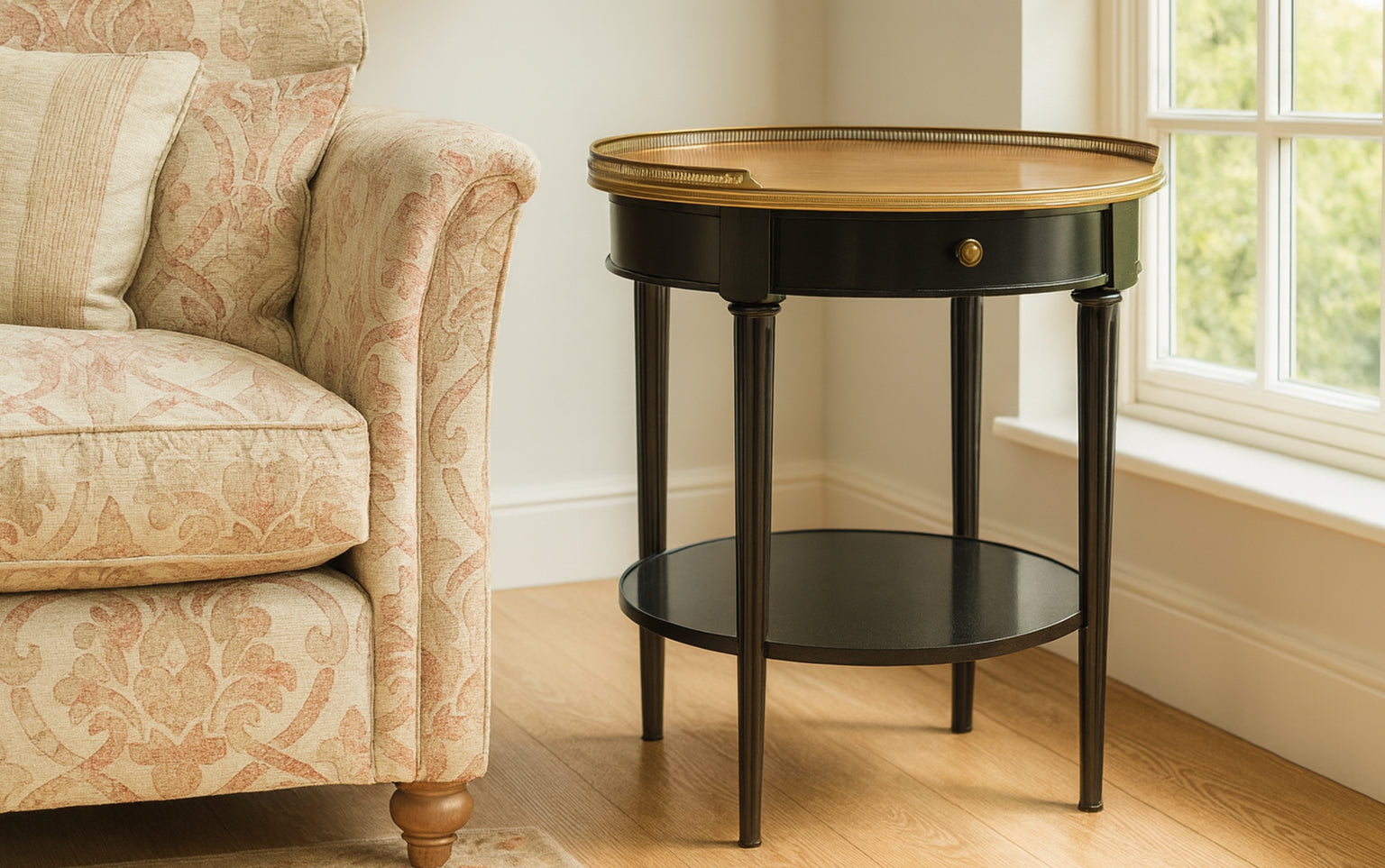 Wunderschöner runder schwarzer Beistelltisch mit goldfarbenem, erhöhtem Rand aus unserer La Fayette Kollektion. Der Tisch verfügt über eine Ablagefläche und eine Schublade.