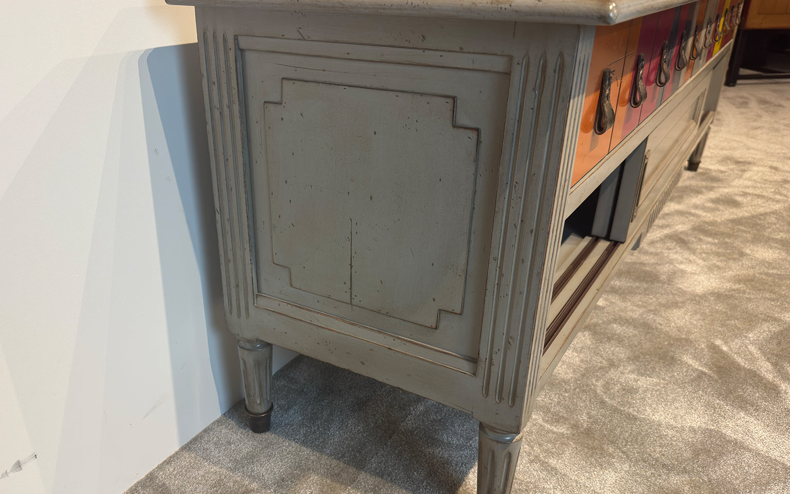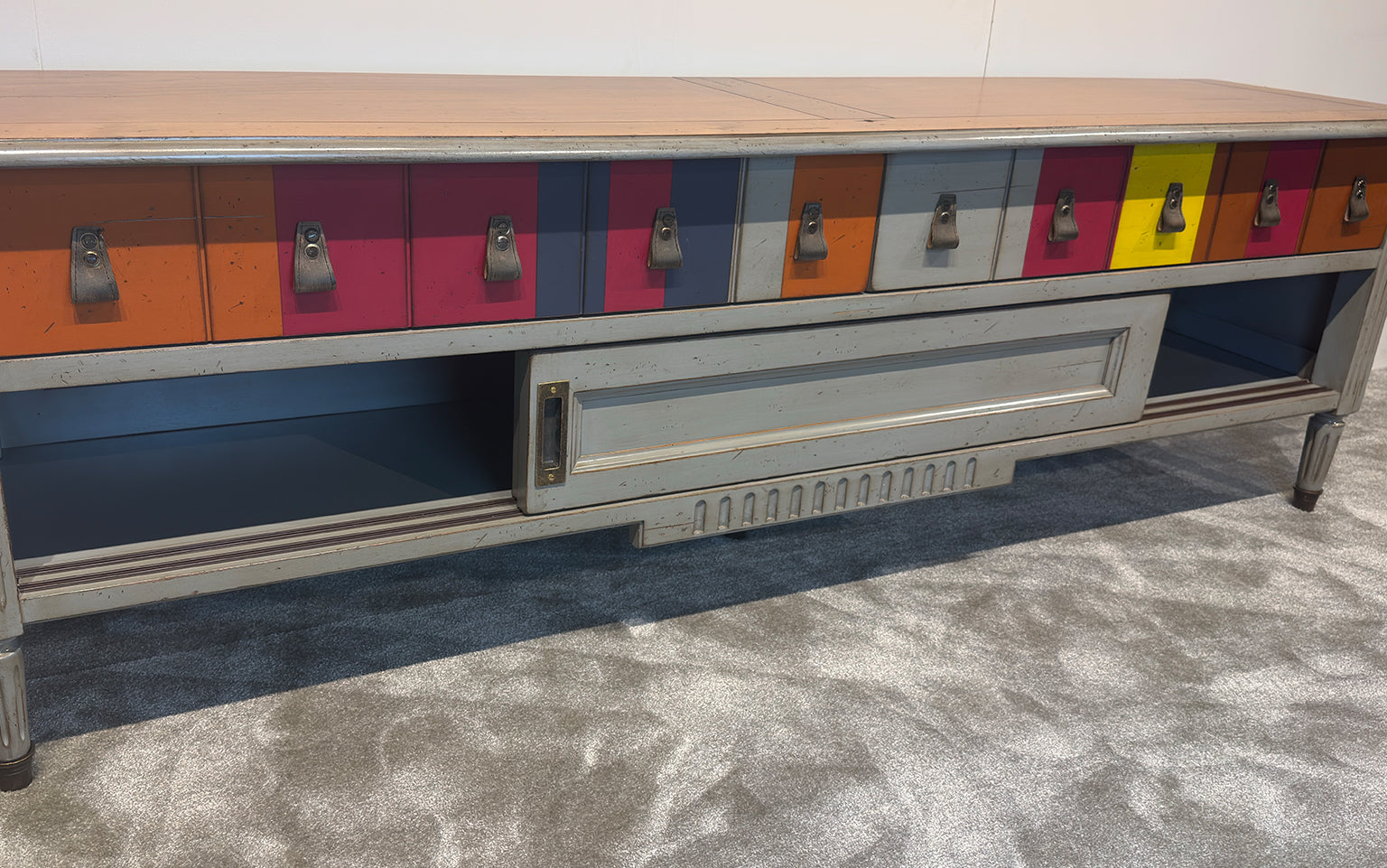 Dieser elegante niedrige TV-Schrank, ausgestattet mit zwei praktischen Schubladen und zwei offenen Fächern, bietet nicht nur ausreichend Stauraum, sondern sorgt auch dafür, dass alle Kabel unsichtbar bleiben.