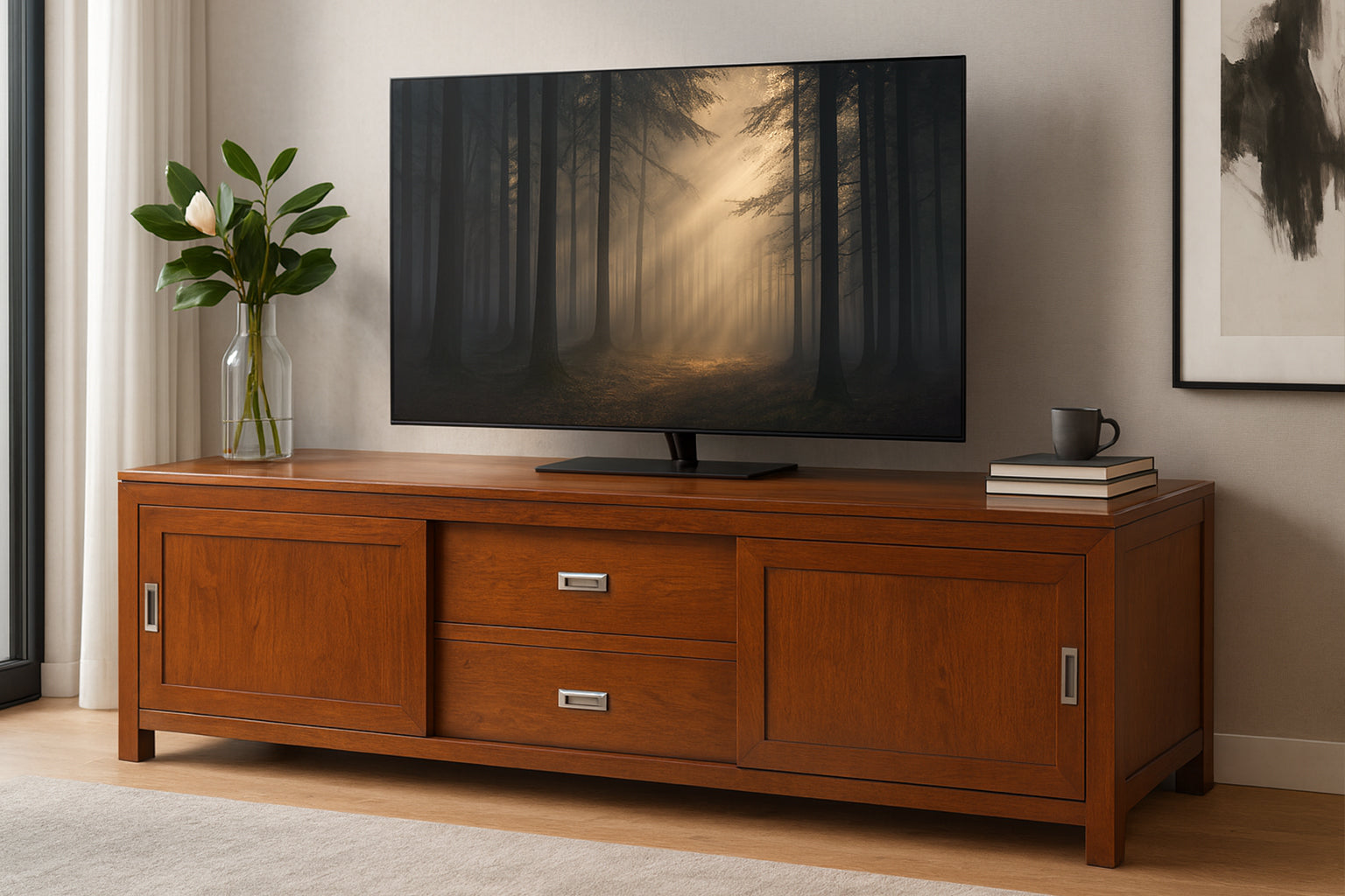 Der TV-Ständer Sienna vereint klassische Gemütlichkeit mit modernem Design. Gefertigt aus massivem Kirschholz in sattem Farbton, strahlt dieses Möbelstück Eleganz und Qualität aus. Die beiden Schiebetüren und Schubladen bieten praktischen Stauraum für Geräte, Kabel und Zubehör, während sich das schlanke Design nahtlos in moderne wie auch zeitlose Interieurs einfügt. Ein stilvoller Blickfang für Ihr Wohnzimmer, der Funktionalität und Eleganz vereint.