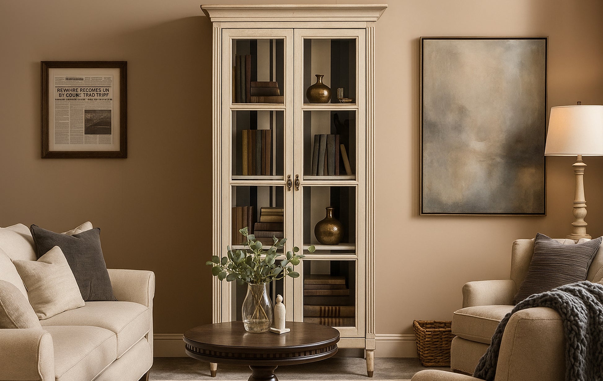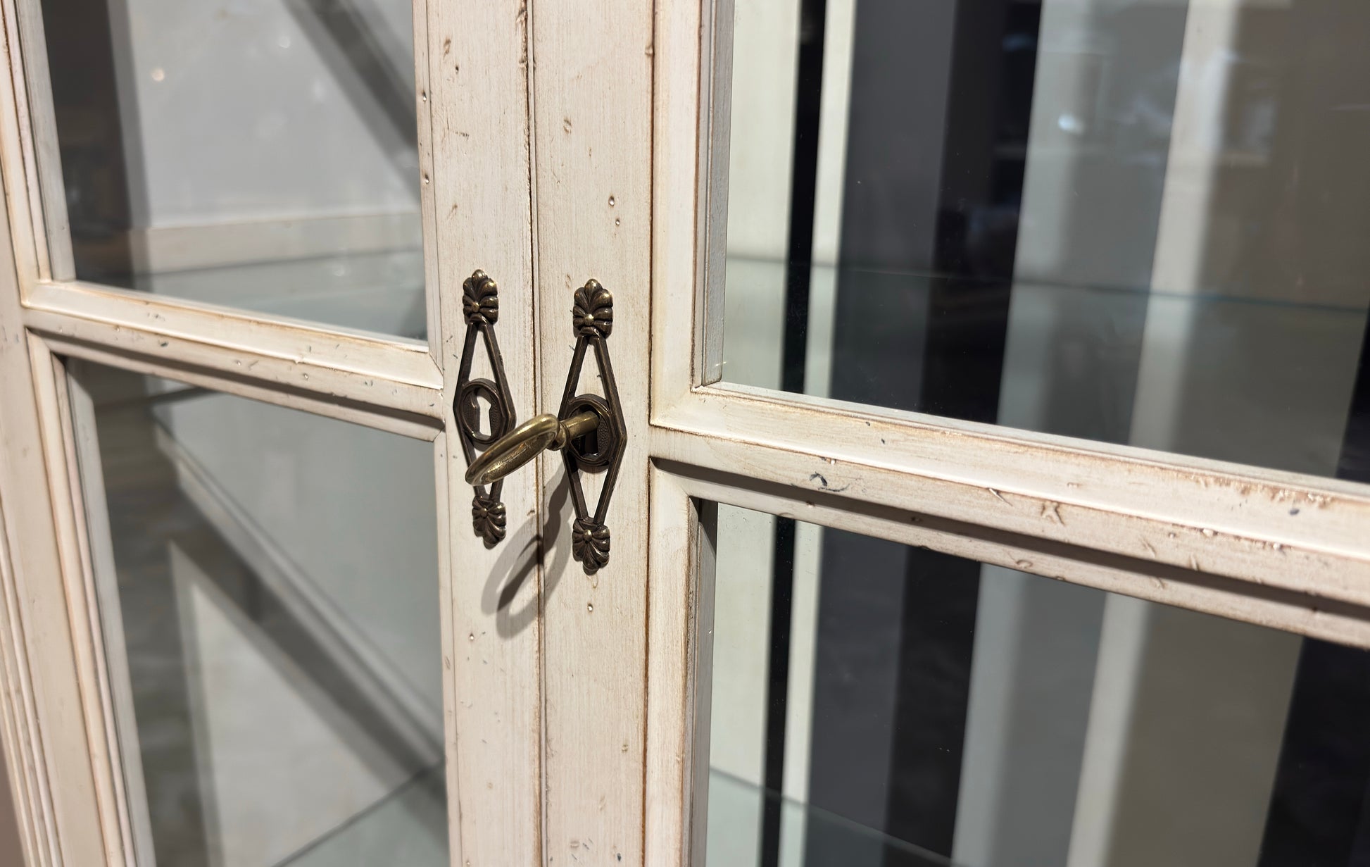 Eine elegante Vitrine aus der Jacob-Kollektion von New Grange . Diese Vitrine ist mit Beleuchtung und wahlweise Glas- oder Holzböden erhältlich. Die markante, gestreifte Rückwand verleiht dem Design eine einzigartige und stilvolle Optik. Die warme Kirschholzoptik verleiht der Vitrine ein zeitloses und unverwechselbares Ambiente.
