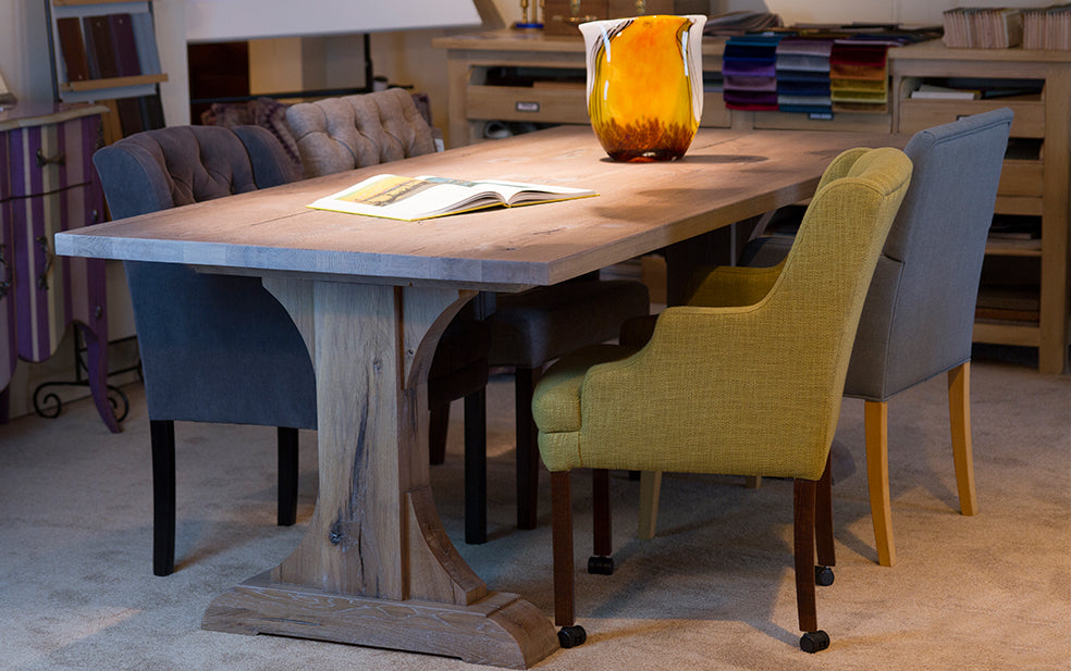 Sturdy oak dining table with beautiful cross leg from our Provencal collection. Can be supplied in any desired wood color and size. You can also choose from a smooth to a completely antique finish.