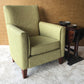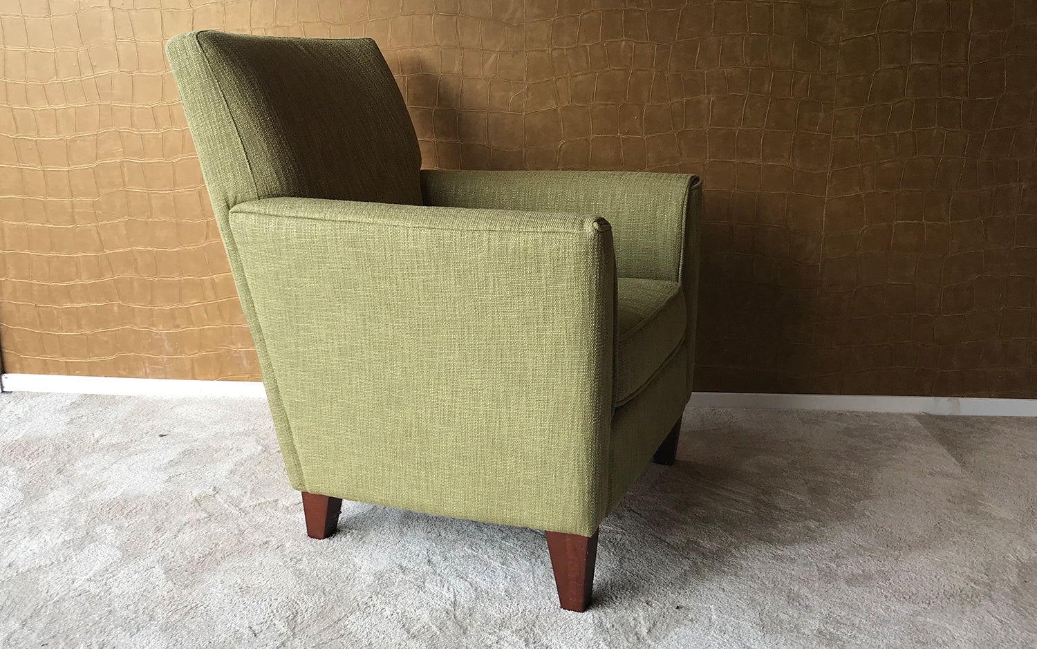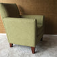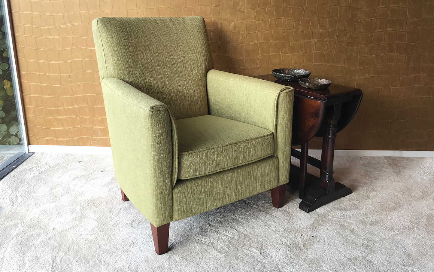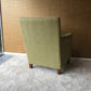 Compact and stylish, the Meda armchair in light green fabric with tapered legs is a perfect addition to any interior.