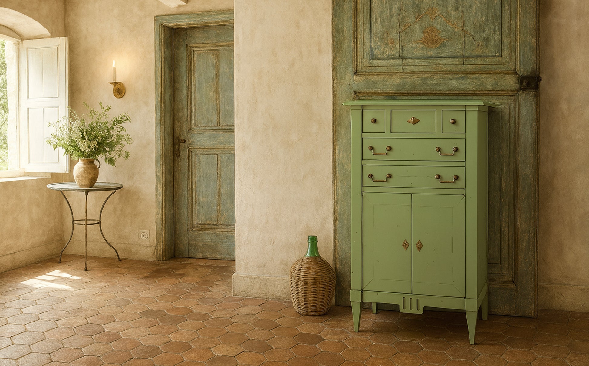 This hallway cabinet is a charming, classic piece with a rustic feel. It features a soft, matte green-gray finish—a shade reminiscent of French farmhouse furniture from the past. The cabinet's narrow, tall design makes it ideal for hallways or entryways where space is limited.