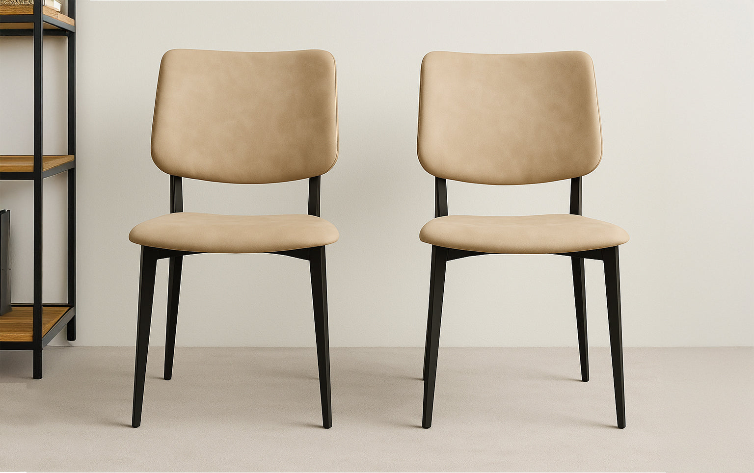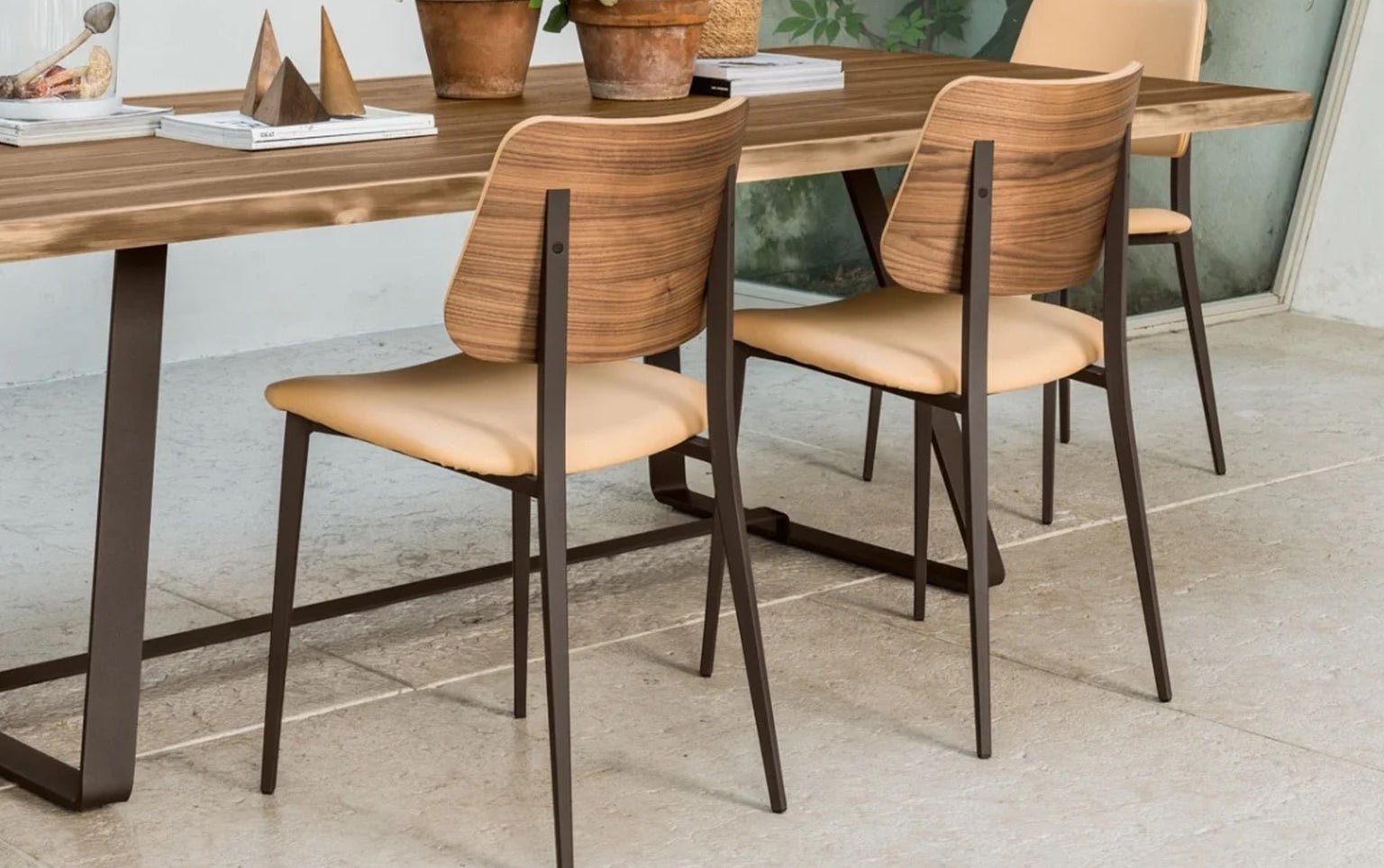 The seat and backrest are available in various finishes, including fabric, leather, or eco-leather, and can also be combined with a wooden backrest in veneer or solid wood, creating a warm and natural look. This version, with beige upholstery and a walnut veneer backrest, beautifully demonstrates how materials can enhance each other: soft and warm versus sleek and modern.