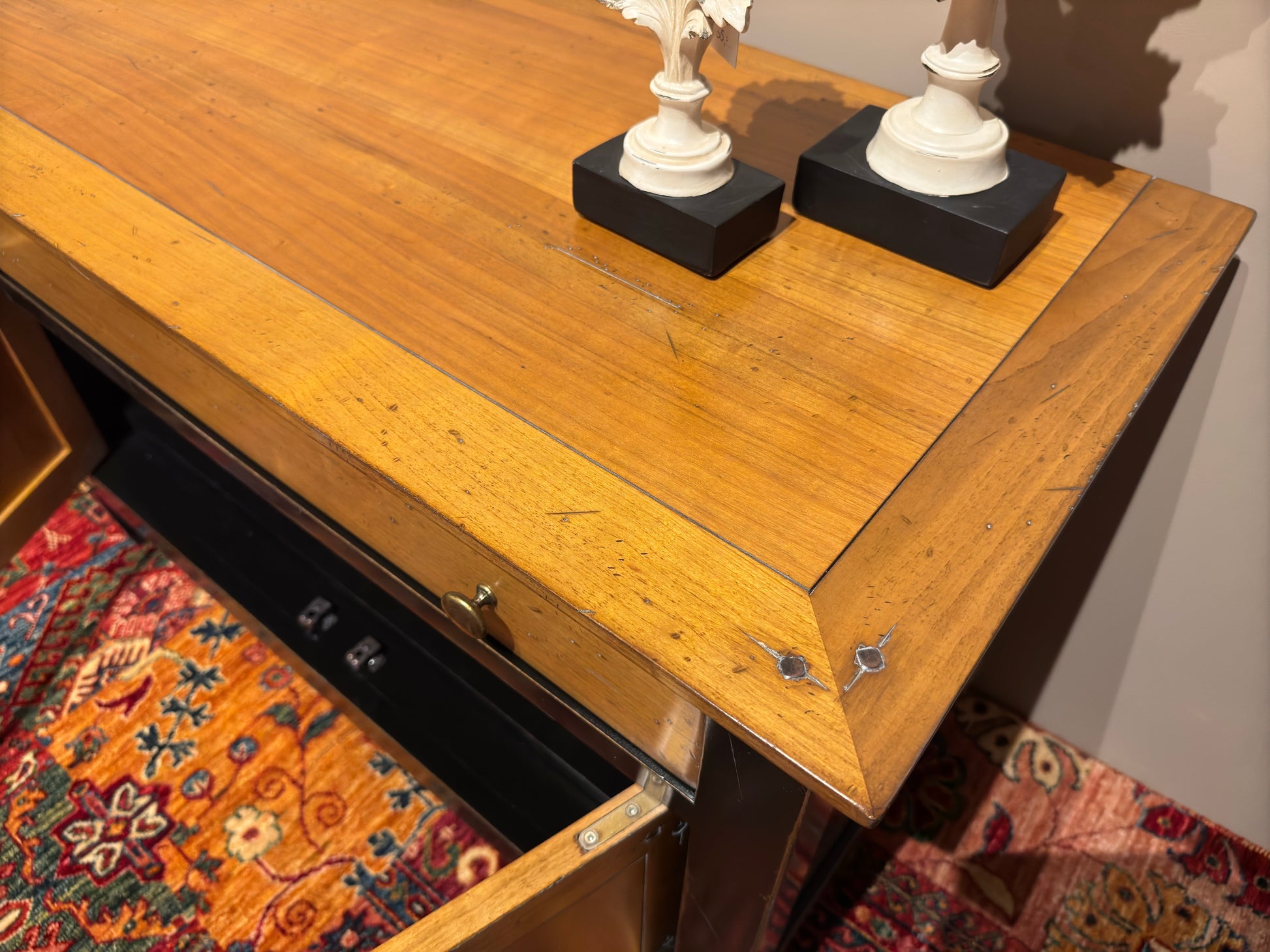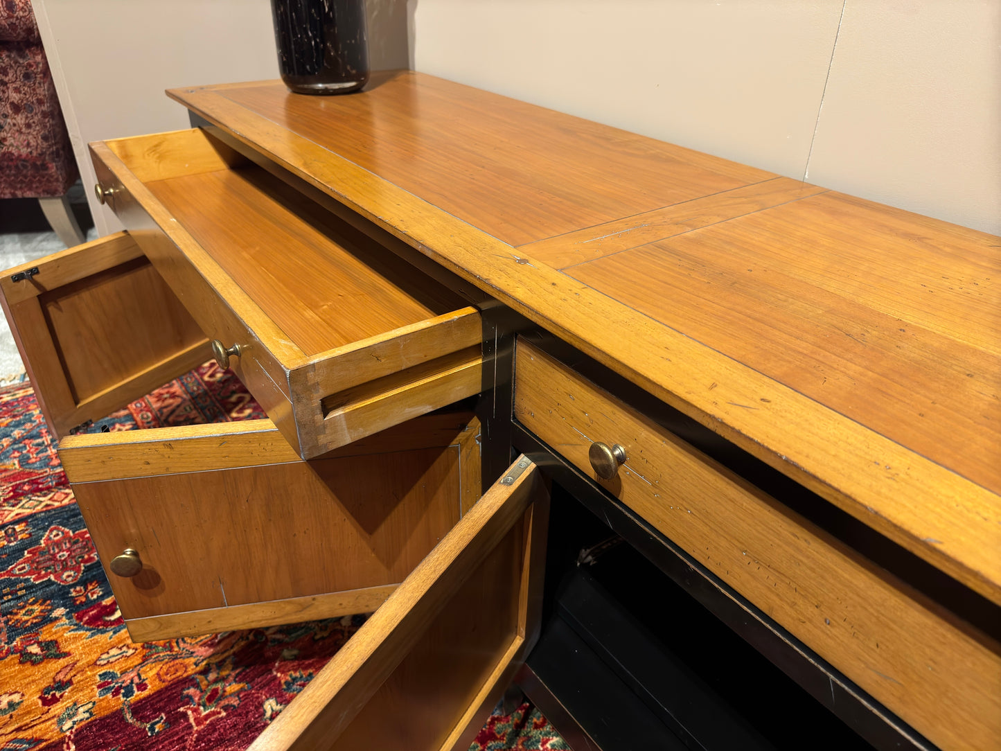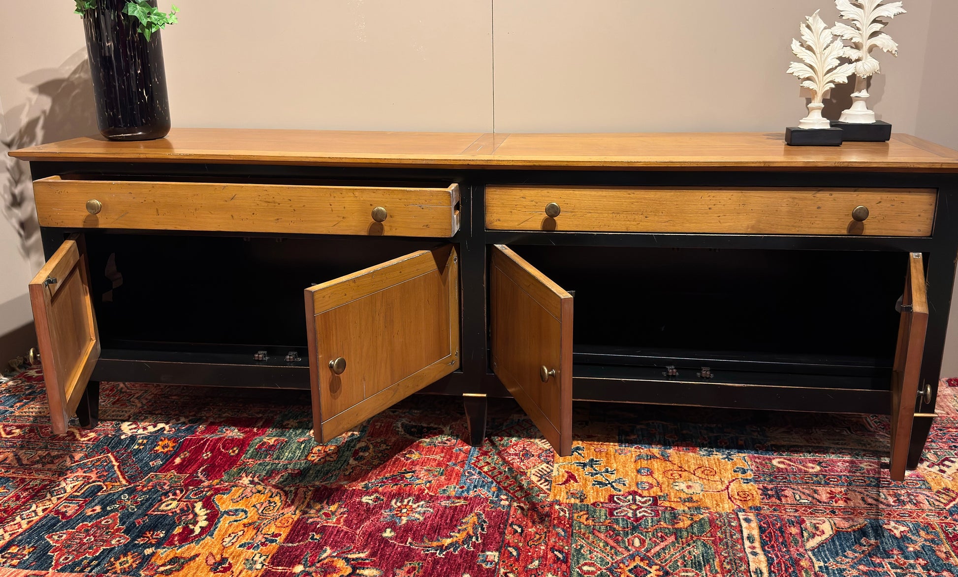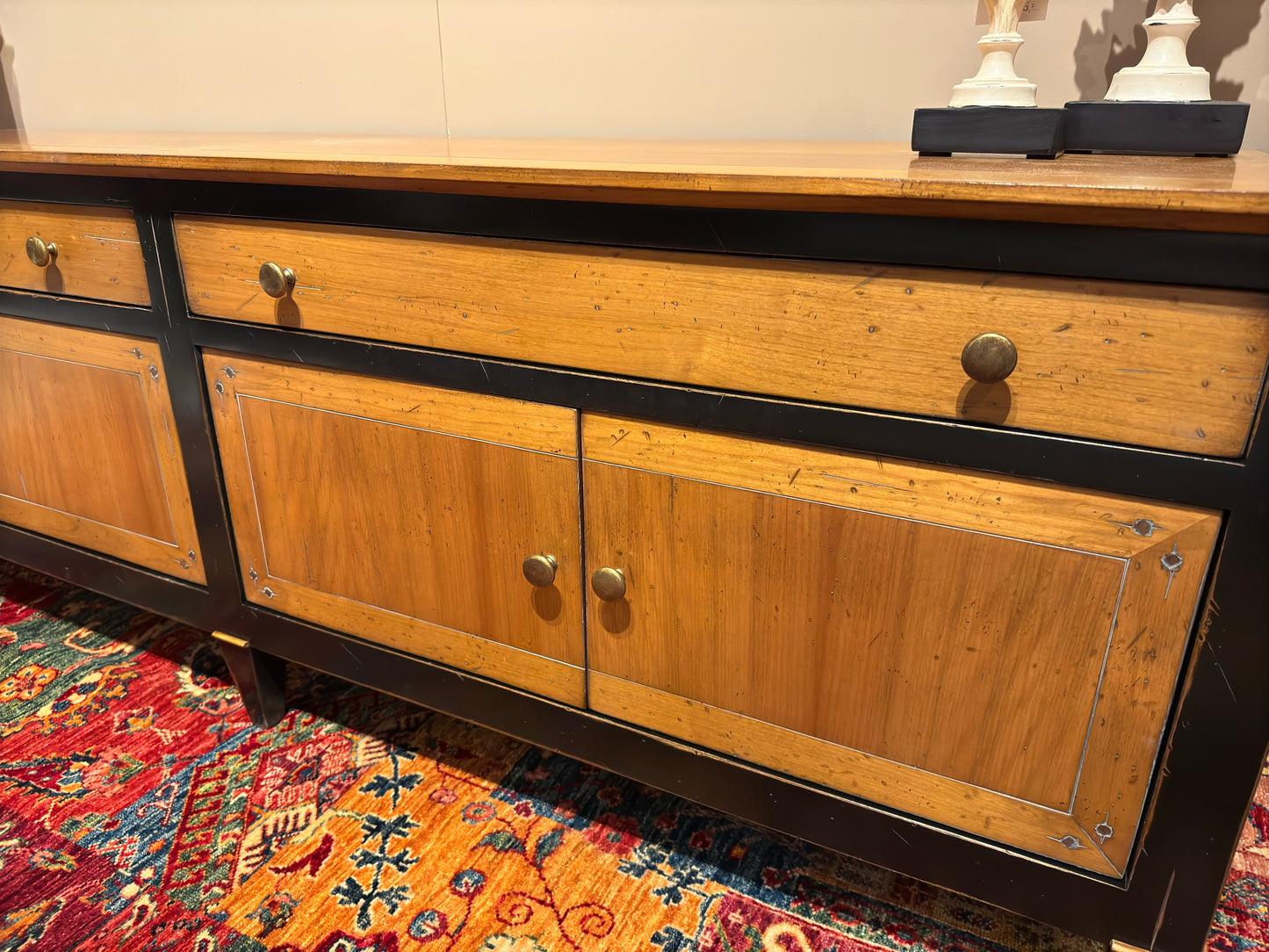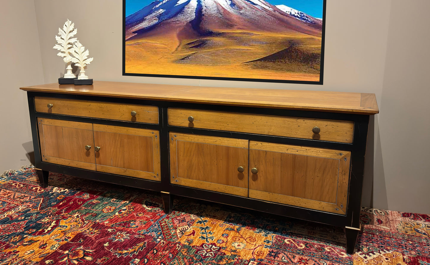 With a refined mix of warm wood tones and dark accents, this TV cabinet will bring a touch of French sophistication to your living room. The brass details and sleek lines emphasise the neoclassical character, while the generous storage space is perfect for neatly storing appliances, cables and accessories.