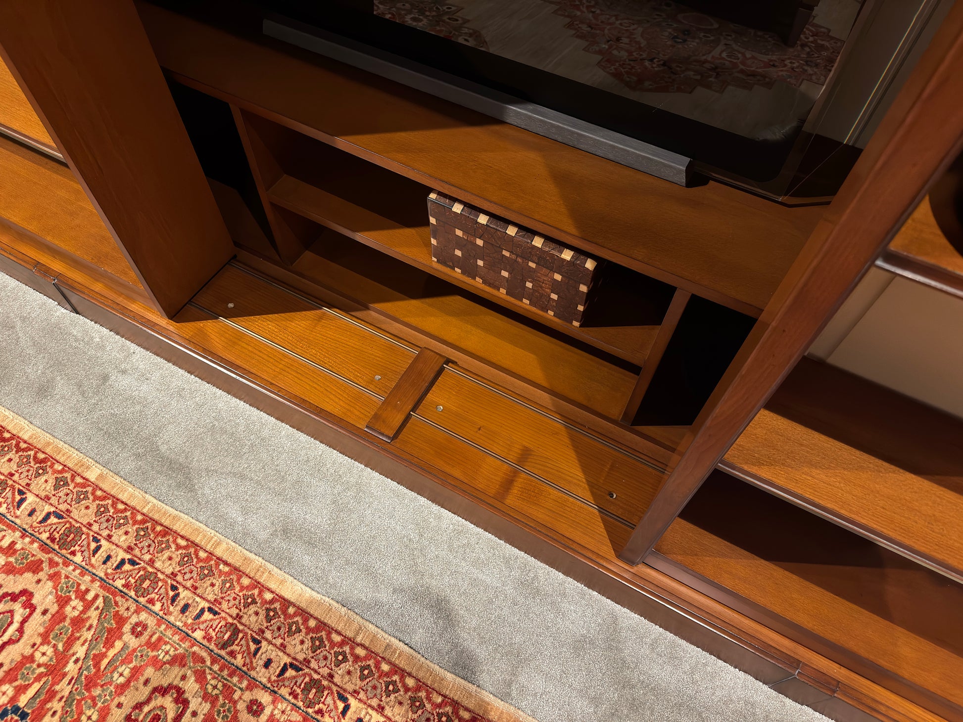 This elegant TV stand with sliding panels combines practicality with a stylish look. With the panels open, the TV becomes the focal point of the living room, yet with a simple movement, it can be subtly concealed behind the woodwork. The warm wood tones complement a modern, light interior beautifully, creating a balance between classic craftsmanship and a contemporary lifestyle.