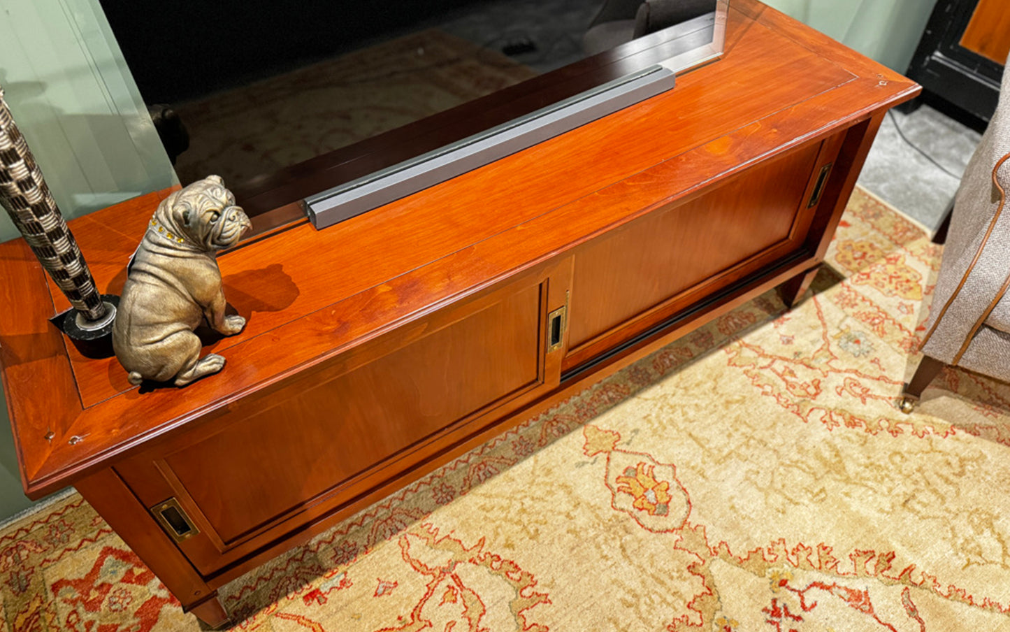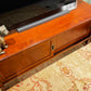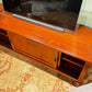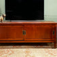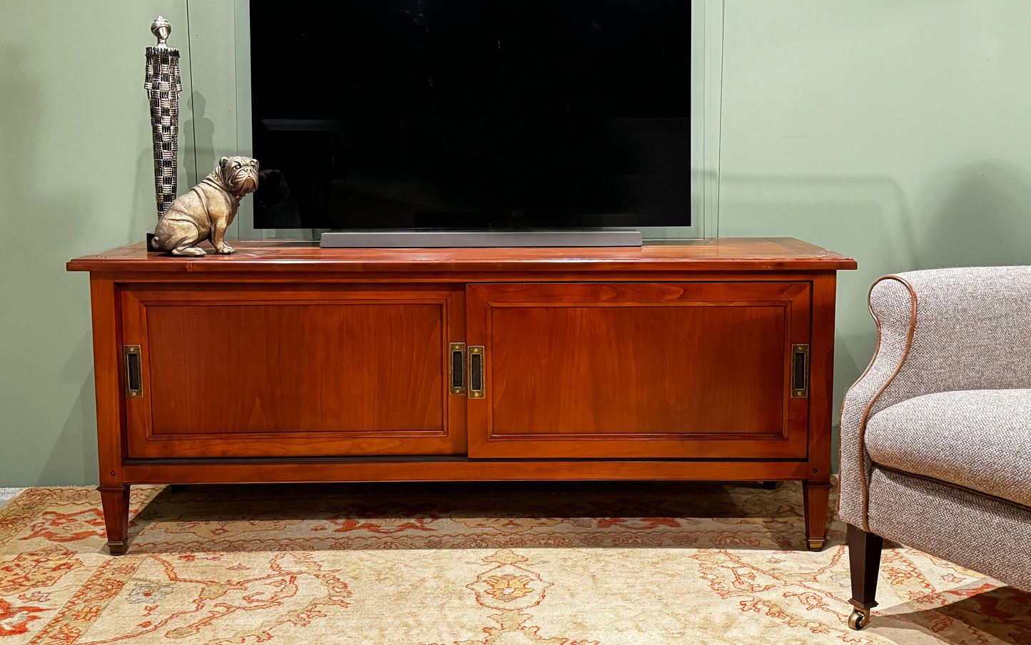 Create an atmosphere of timeless refinement with our low TV stand, expertly crafted from cherry wood and featuring two sliding doors for effortless storage.