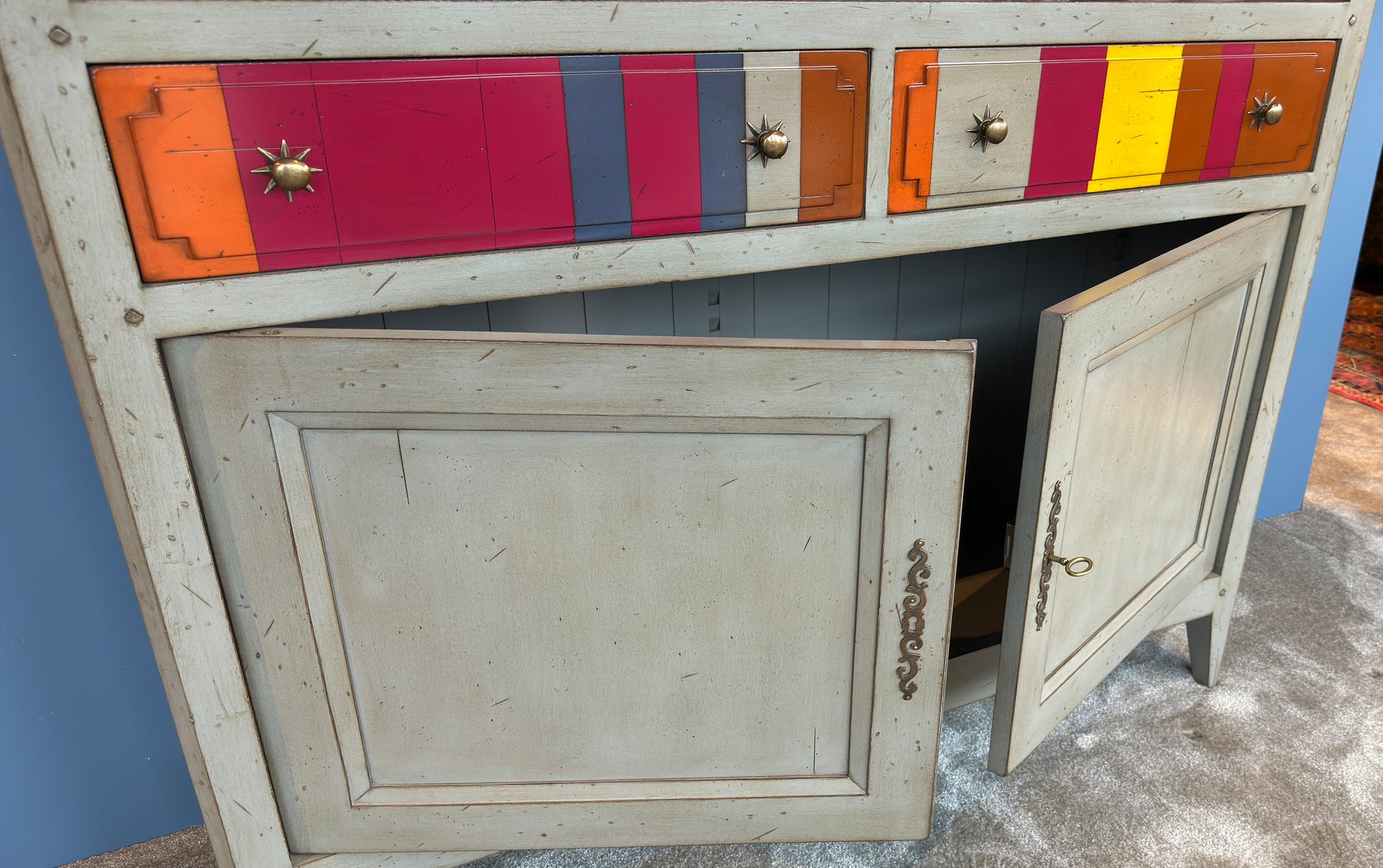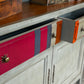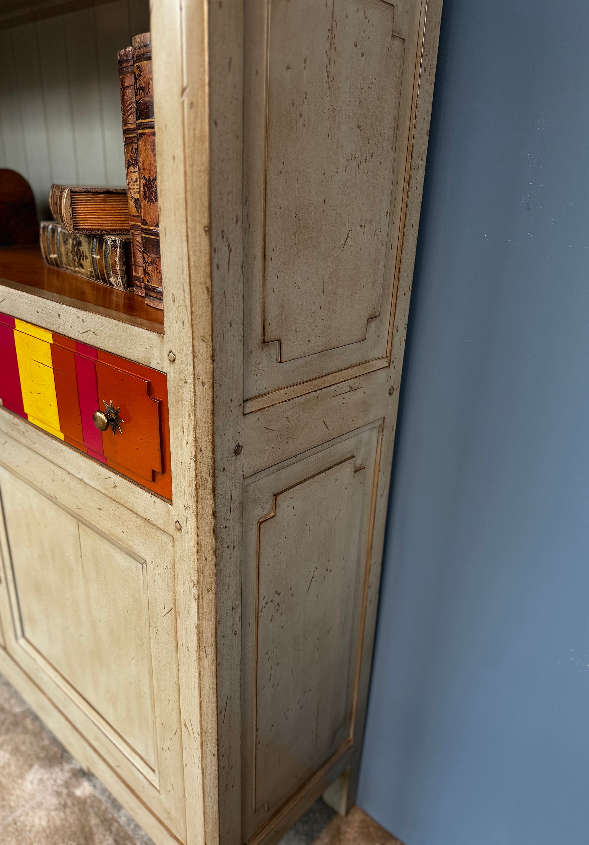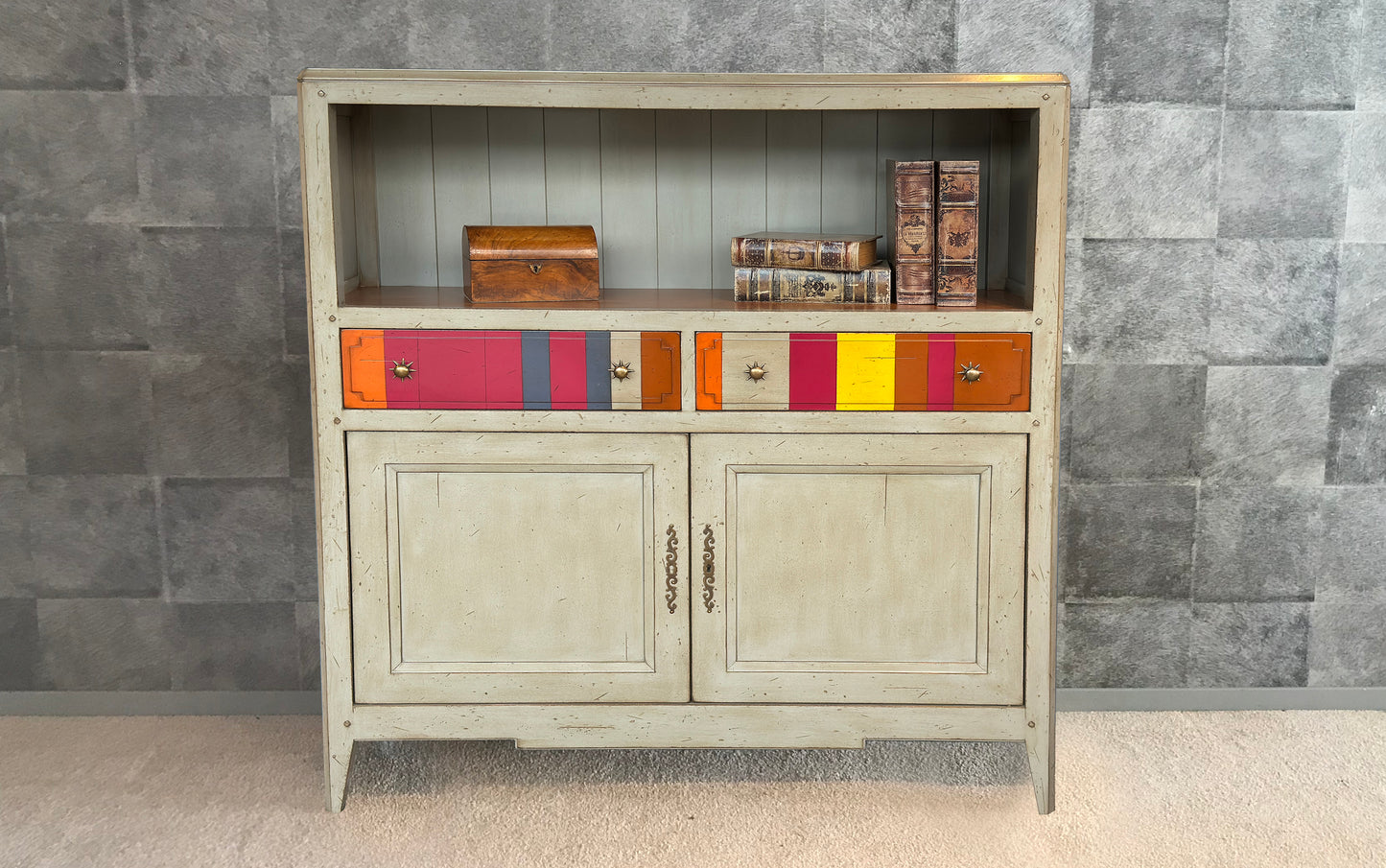 De boekenkast Jacob is een prachtig meubelstuk dat zowel functioneel als stijlvol is. Met zijn twee lades en twee deuren biedt het de nodige opbergruimte voor boeken en persoonlijke bezittingen. Het opvallende streeppatroon op de lades geeft de boekenkast een unieke uitstraling. Door uw eigen kleurstellingen te kiezen voegt u een vleugje speelsheid en persoonlijkheid toe aan de kast, waardoor het een echte blikvanger wordt in uw interieur.