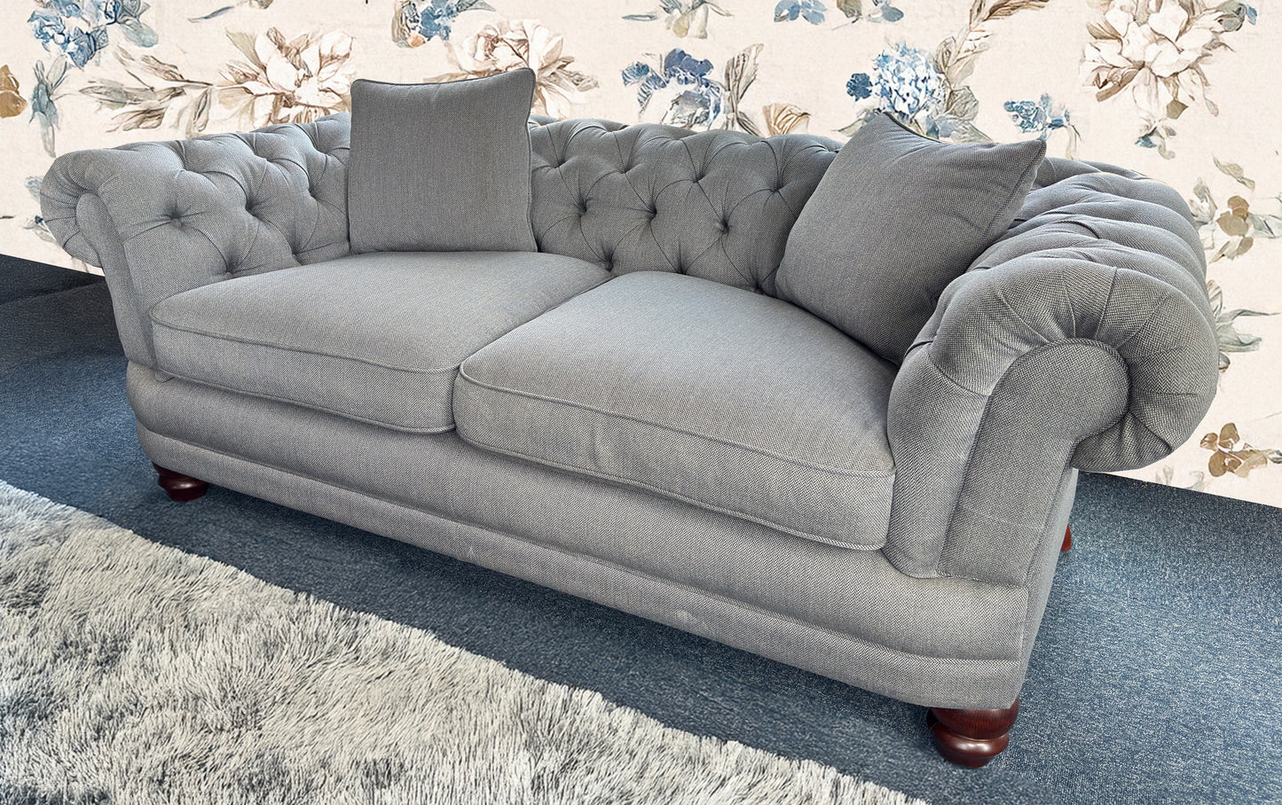 Ontdek de tijdloze elegantie en ongeëvenaarde comfort van onze prachtige Chesterfield bank, volledig bekleed in stof. Deze bank combineert moeiteloos klassiek design met moderne verfijning, waardoor het een stijlvolle blikvanger wordt in elke woonruimte.