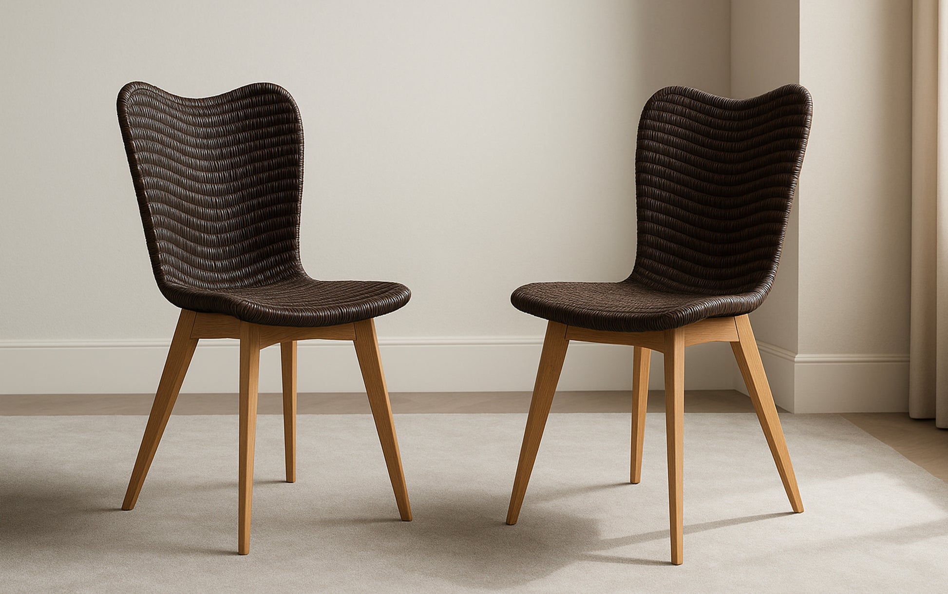 De afbeelding toont twee Lloyd Loom-stoelen van Vincent Sheppard. De stoelen hebben een elegante, eigentijdse vorm met een organisch gebogen rugleuning en een zitting van fijn geweven papierkoord (Lloyd Loom) in een donkerbruine tint.