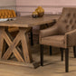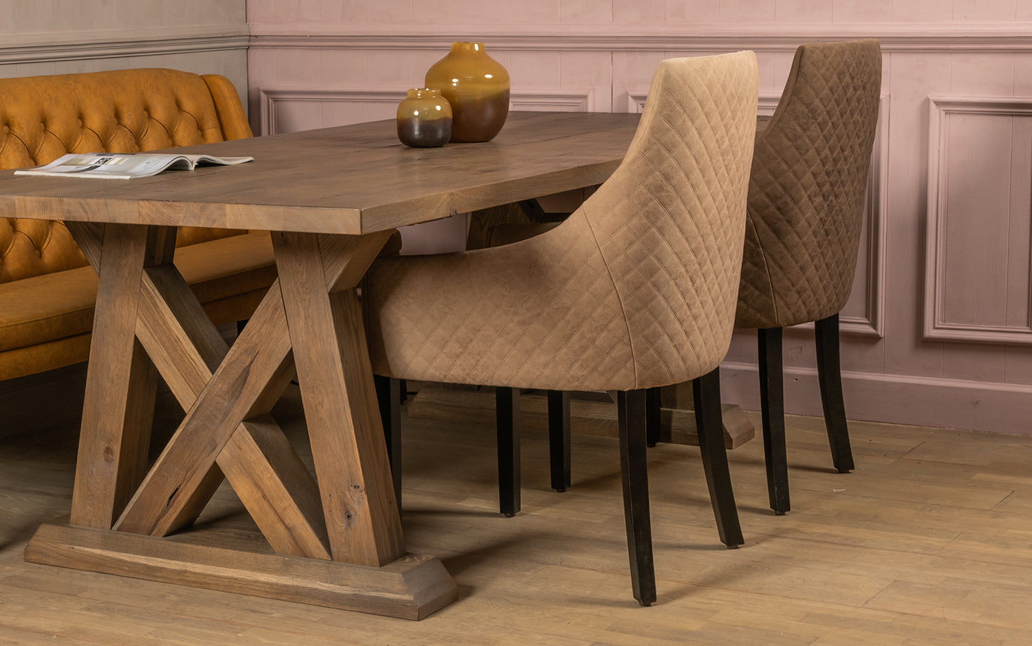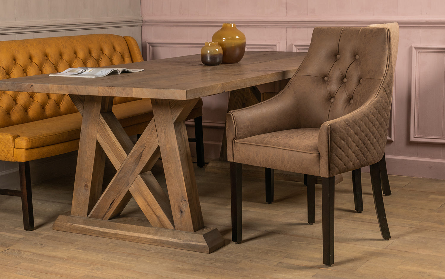 Eetkamerstoel met arm en gecapitonneerde rug.