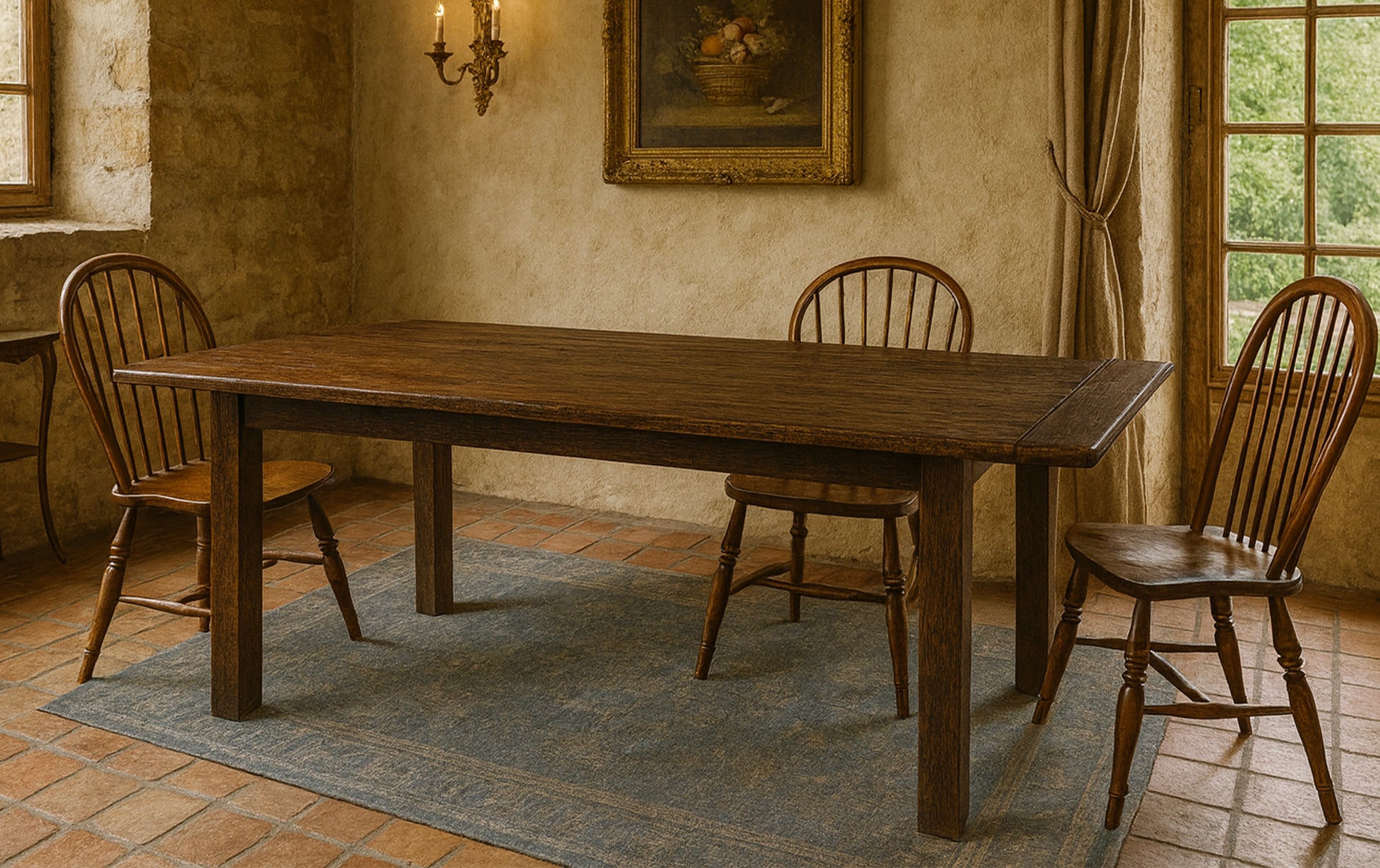 Deze robuuste eettafel is vervaardigd uit massief eikenhout en straalt de charme van oud Frans vakmanschap uit. Het blad toont een rijke, donkere houtnerf met een doorleefde uitstraling, die versterkt wordt door subtiele natuurlijke oneffenheden en een authentieke textuur. De rechte, stevige poten geven de tafel een stabiele en tijdloze uitstraling, terwijl de royale lengte de tafel uitermate geschikt maakt voor lange diners en sfeervolle bijeenkomsten.
