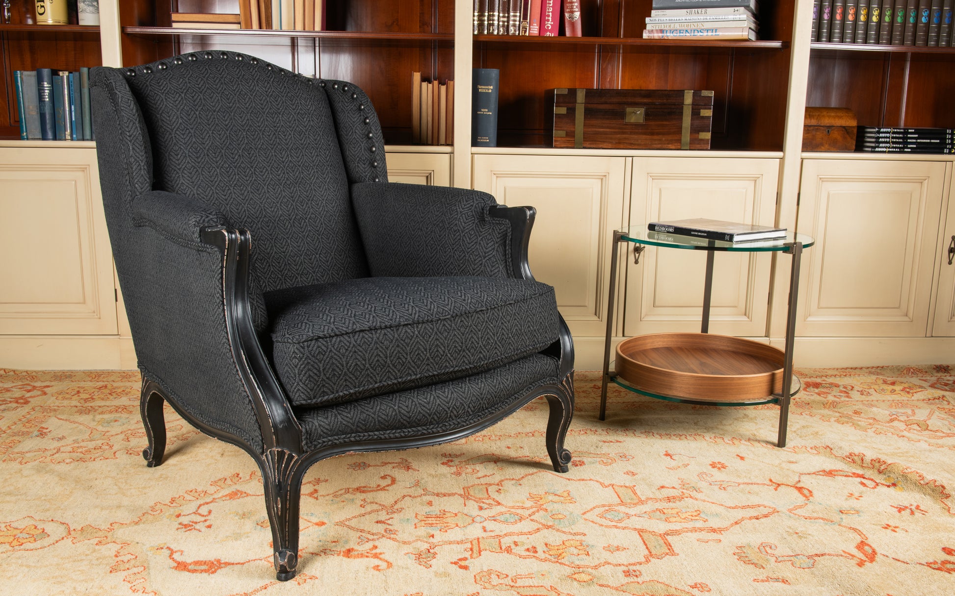 Dompel uzelf onder in tijdloze elegantie met onze bergère fauteuil, gehuld in een prachtige zwart-grijze stof die moeiteloos samensmelt met het warme karakter van hout. Laat u omarmen door het luxueuze comfort en de verfijnde uitstraling van dit meesterwerk, dat een perfecte aanvulling vormt op uw interieur, waarbij het zowel een statement maakt als een oase van rust biedt