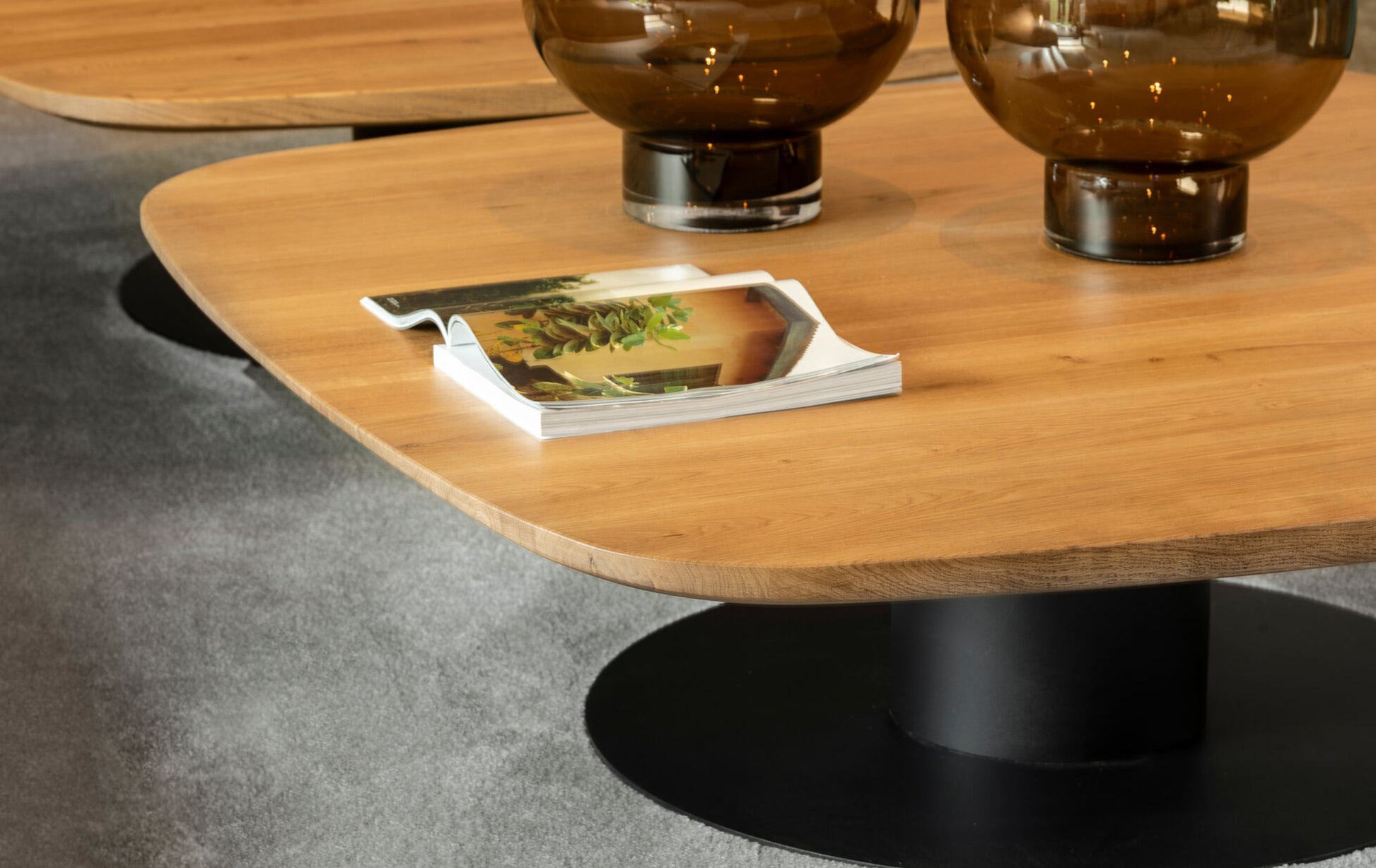 De prachtige eiken salontafel van Passe Partout, met zijn sierlijke ronde stalen poot, biedt een harmonieuze combinatie van materialen en stijl. Deze tafel is verkrijgbaar in verschillende warme houtkleuren en diverse afmetingen, waardoor hij naadloos aansluit bij elke gewenste interieursetting.