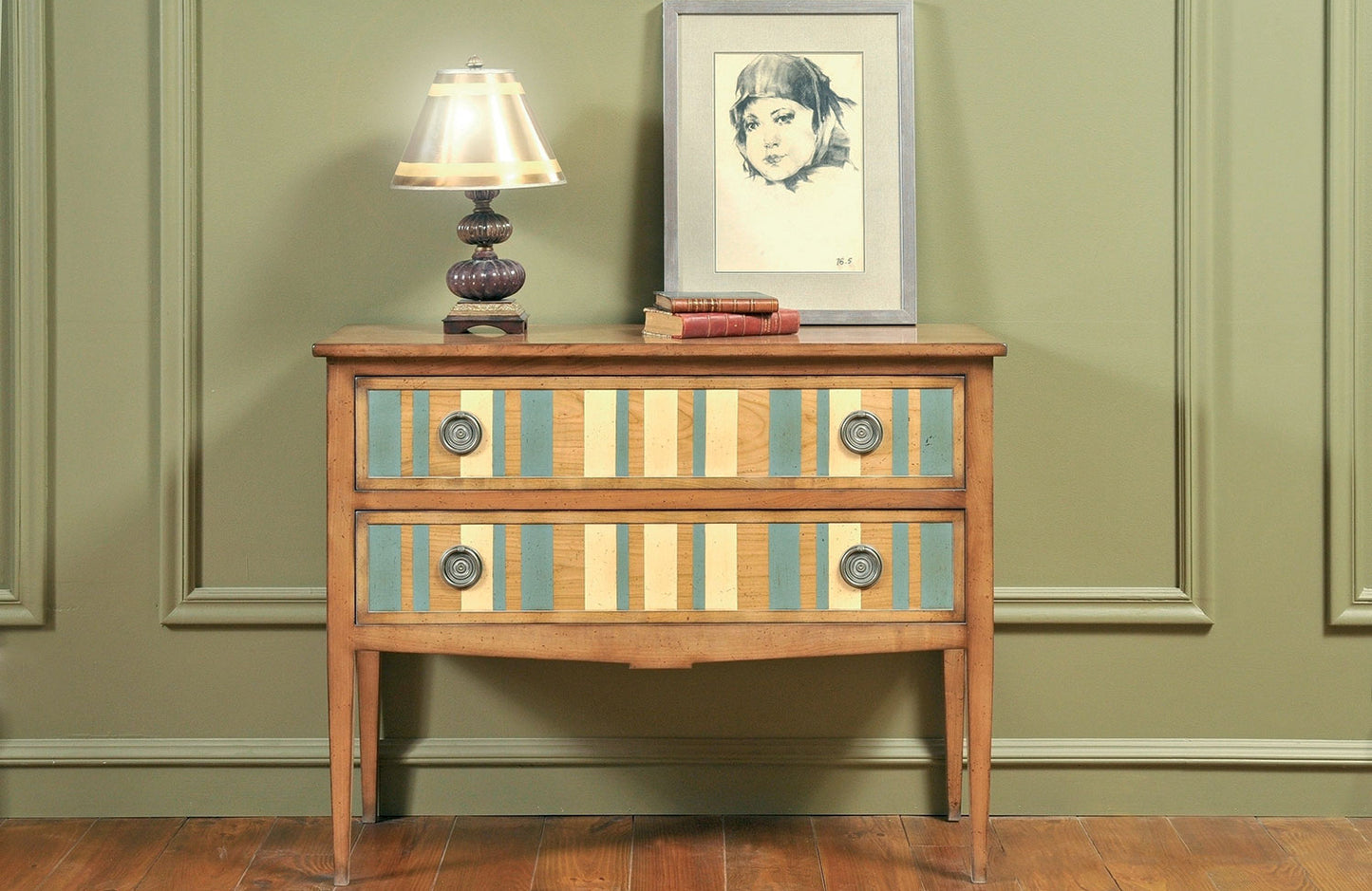 Breng warmte en karakter in je hal met deze unieke vintage ladekast. Het massieve houten frame combineert elegantie met een speelse uitstraling dankzij de handgeschilderde verticale strepen in zachtblauw, crème en honingbruin. De twee ruime lades bieden voldoende opbergruimte voor sleutels, sjaals of andere dagelijkse benodigdheden, terwijl de klassieke metalen ringgrepen zorgen voor een verfijnde afwerking.