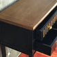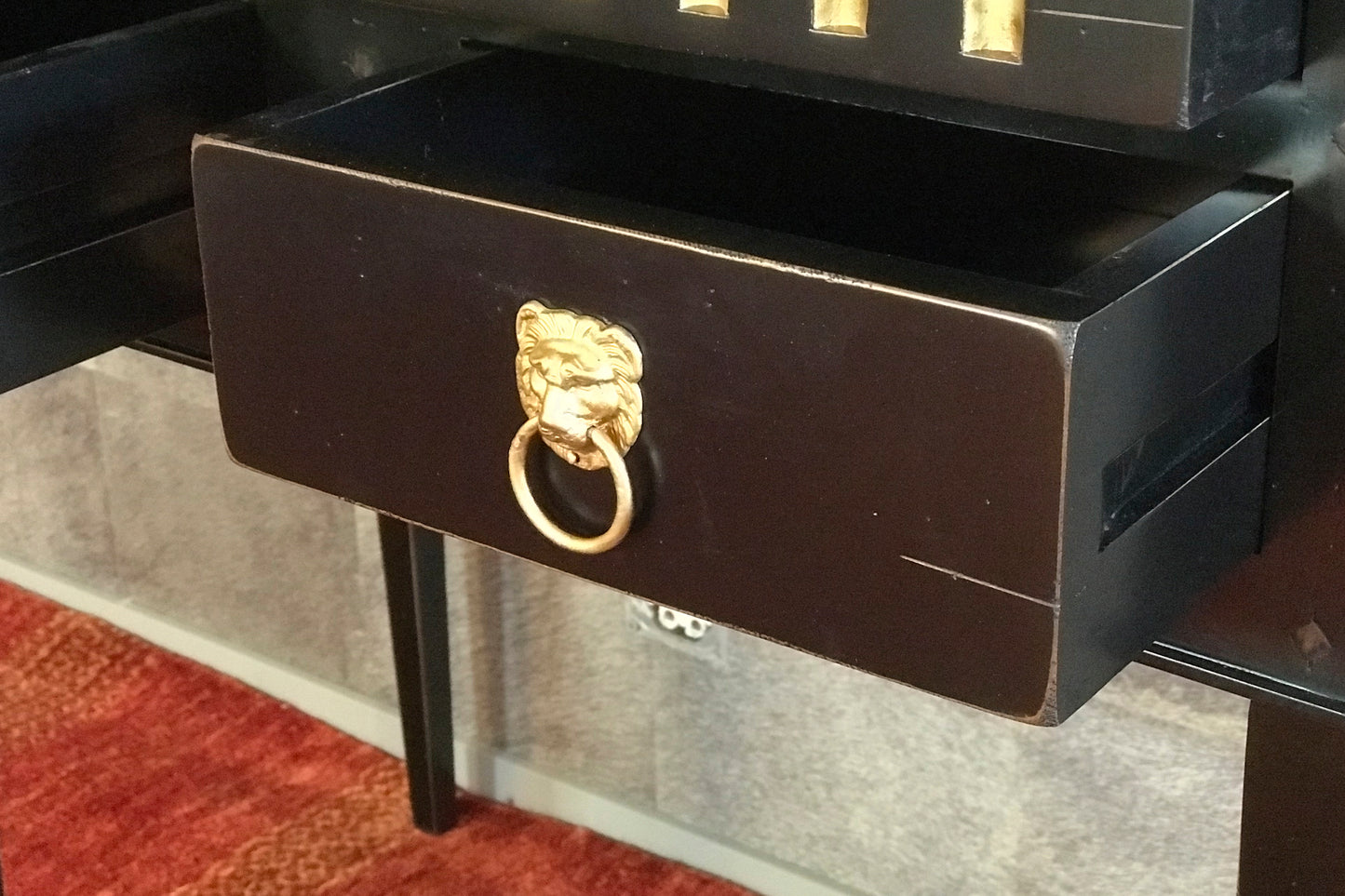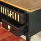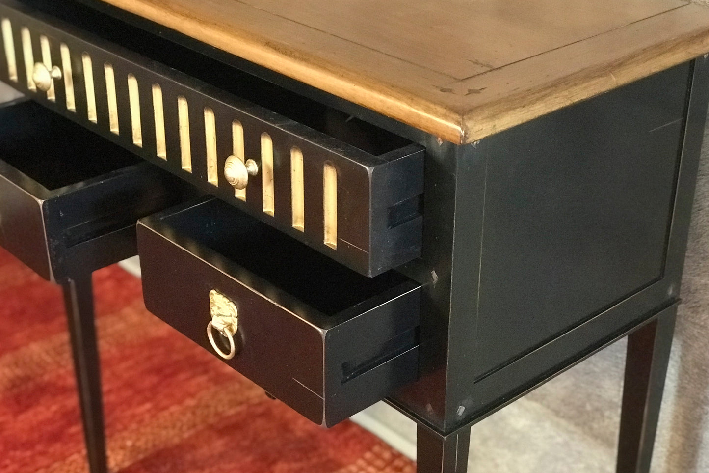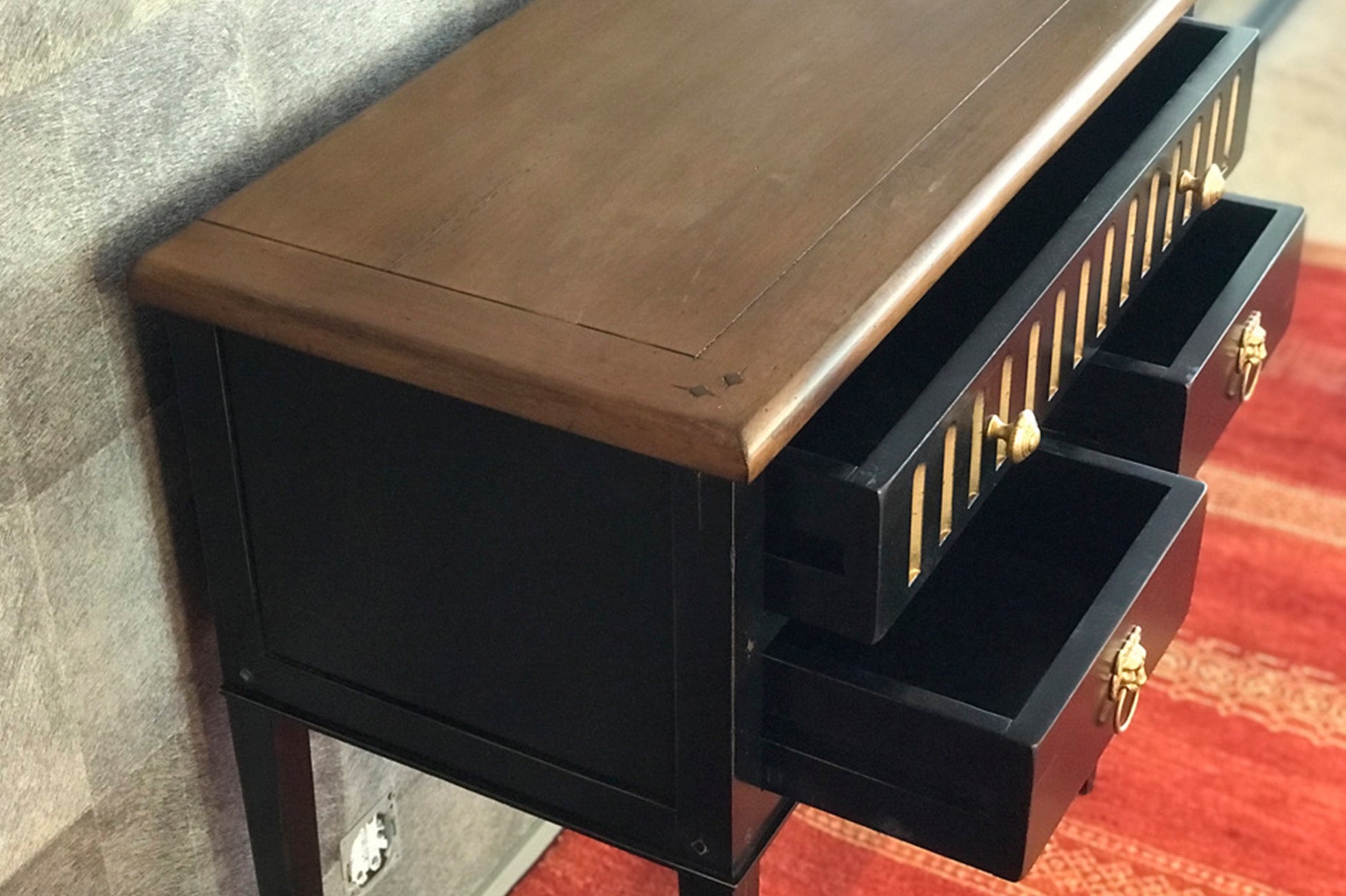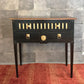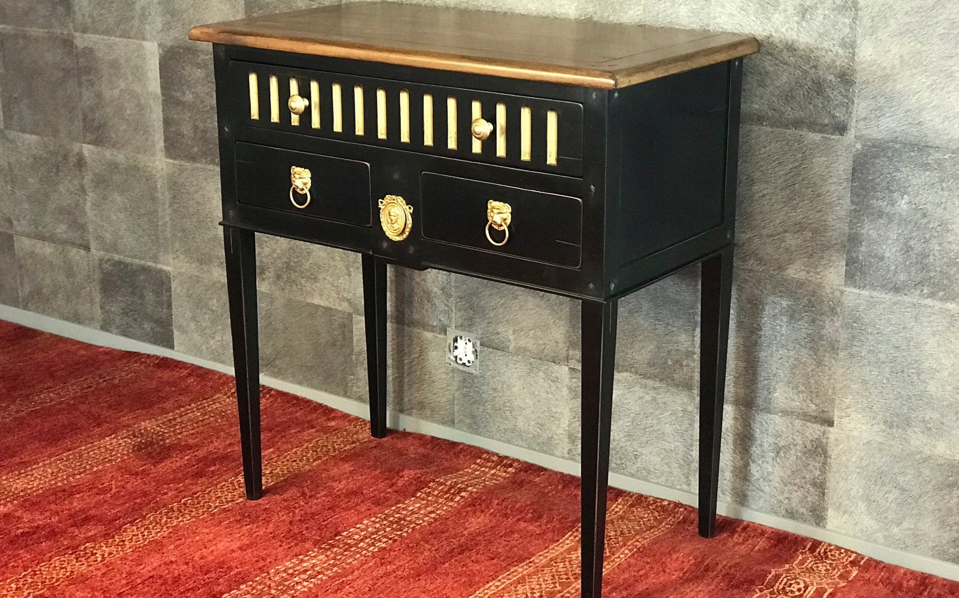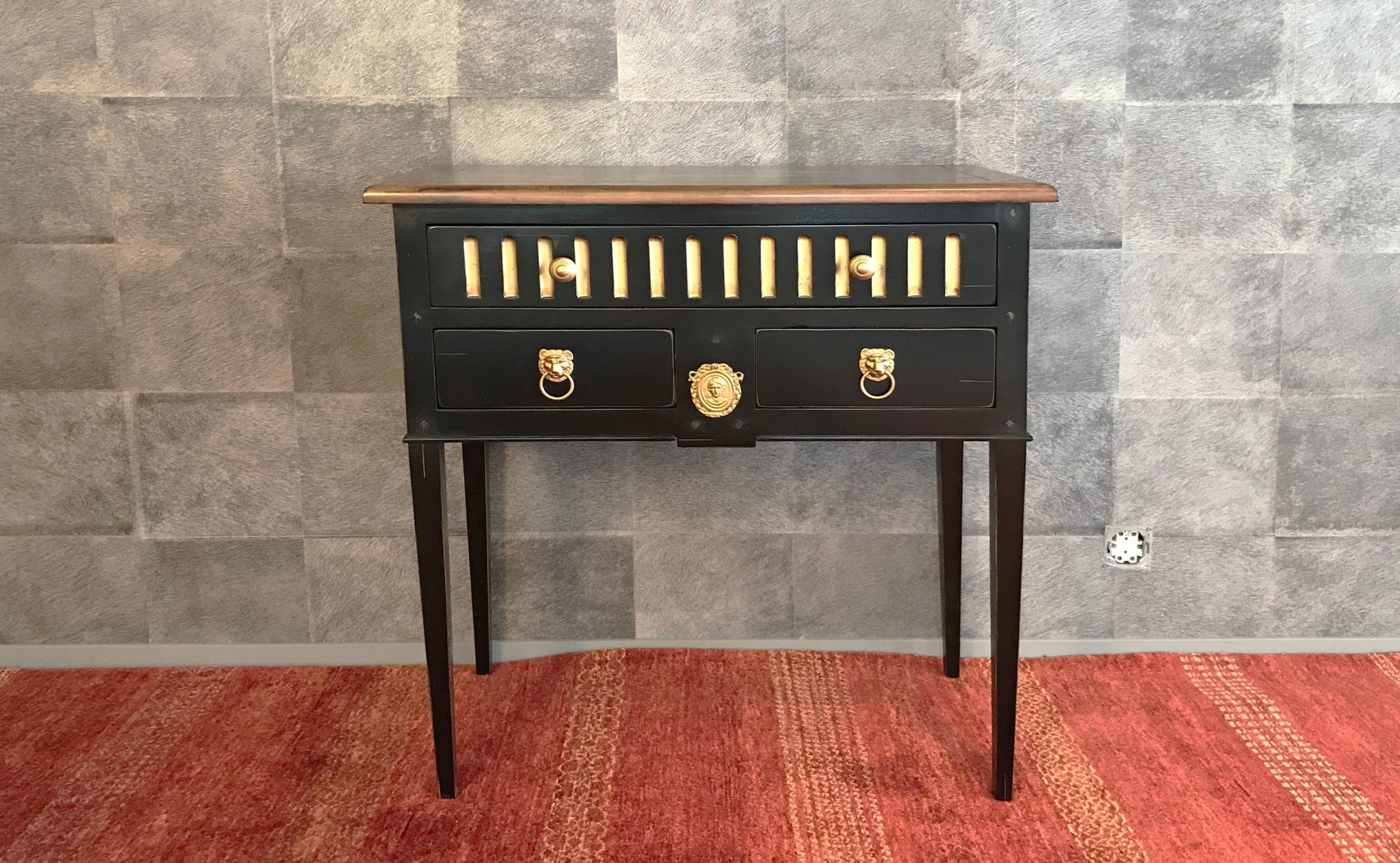 Ontdek de mooie Arles wandtafel, een verfijnd meubel gemaakt van hoogwaardig kersenhout met een elegante zwarte kleur en prachtige goudkleurige details. Dit meubelstuk, vervaardigd in Europa, heeft een ruime en handige grote lade, samen met twee kleine lades voor optimale opbergruimte. Voeg een vleugje luxe en functionaliteit toe aan je interieur met dit unieke meubelstuk.