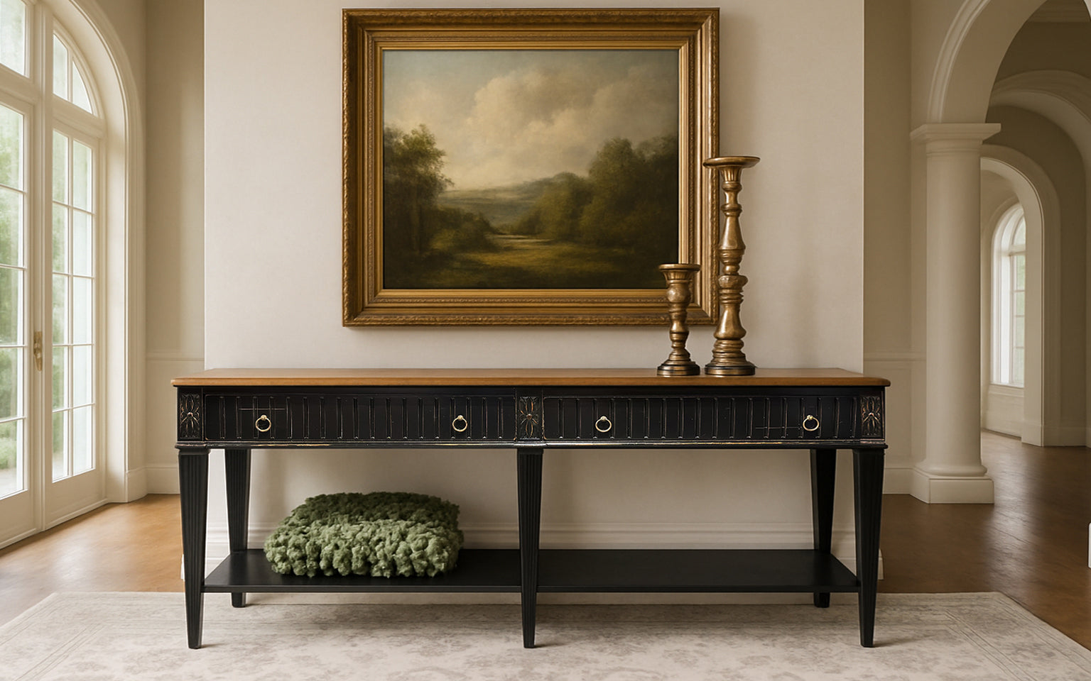 Deze prachtige Provençaalse wandtafel straalt tijdloze elegantie uit. Het warme kersenhouten blad vormt een sfeervol contrast met het zwartgelakte onderstel, dat is verfraaid met subtiele houtsnijwerken en goudkleurige ringgrepen. De fijne verticale groeven en de delicate bloemmotieven in het hout geven de tafel een authentieke, Franse landelijke uitstraling. De twee lades bieden handige opbergruimte, terwijl de royale plank onderaan perfect is voor decoratieve elementen of praktische accessoires. De sfeervolle styling met antieke boeken en glanzende messing kandelaren benadrukt de charme van dit meubelstuk, dat moeiteloos past in een klassiek of landelijk interieur.
