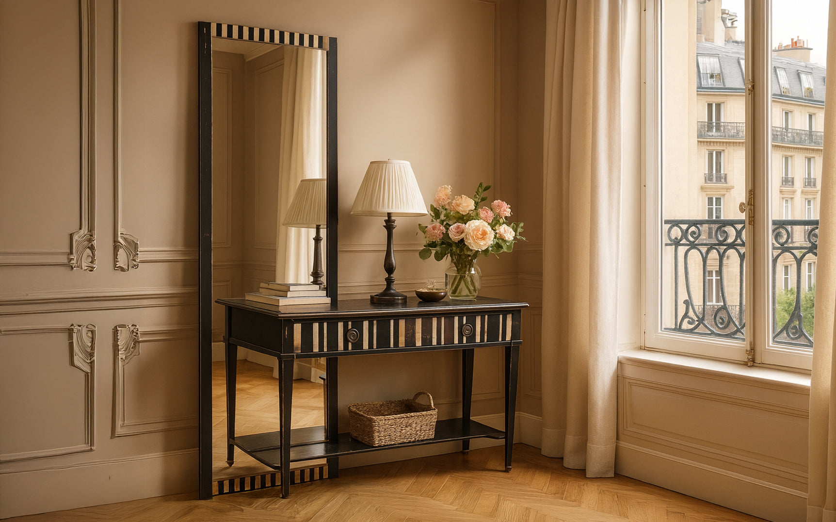 DeLautrec is een elegante Franse wandtafel met spiegel, ontworpen om karakter en verfijning toe te voegen aan elke hal, woonkamer of slaapkamer. Het meubelstuk combineert klassieke lijnen met een moderne, grafische afwerking in zwart en antiek crème.